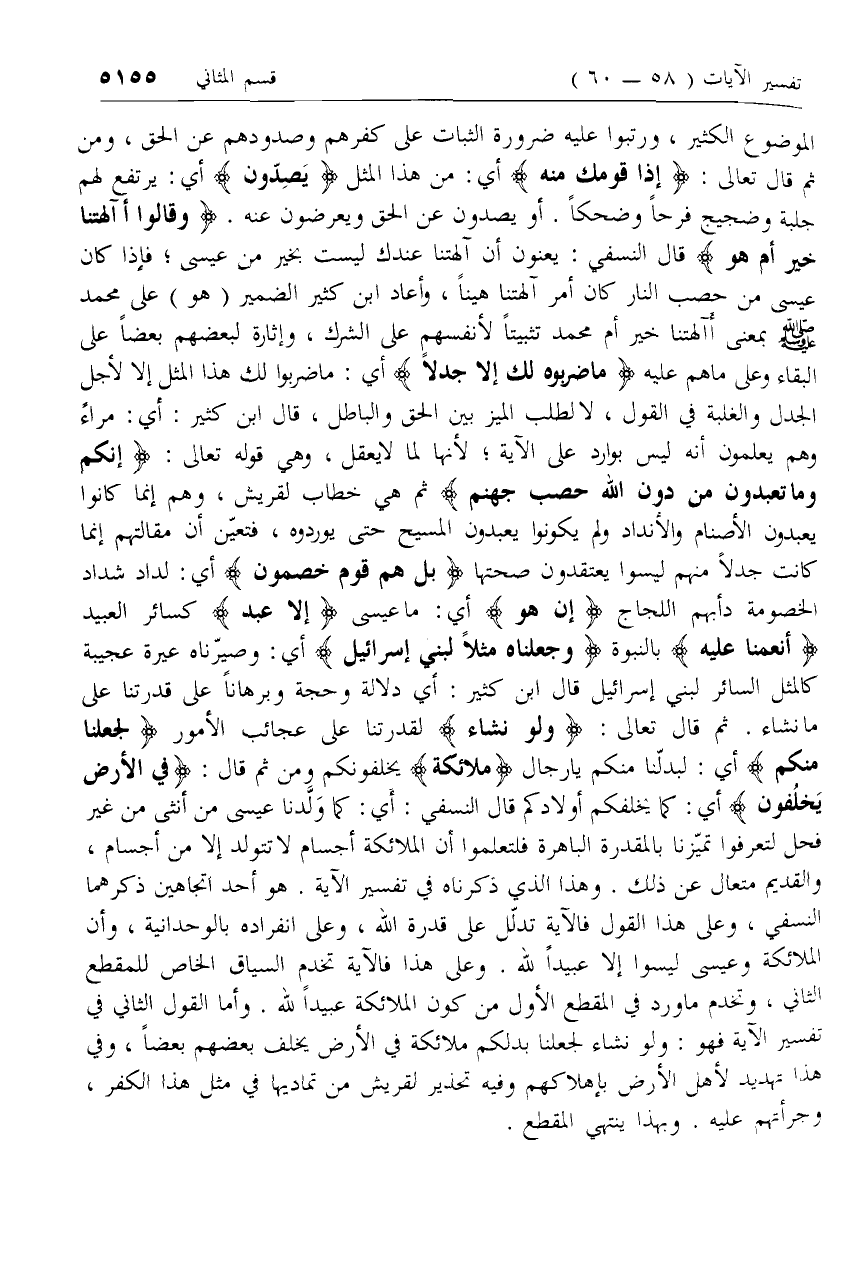 وَقالُوا أَآلِهَتُنا خَيْرٌ أَمْ هُوَ قال النسفي: يعنون أن آلهتنا عندك ليست بخير من عيسى؛ فإذا كان عيسى من حصب النار كان أمر آلهتنا هينا، وأعاد ابن كثير الضمير (هو) على محمد صلّى الله عليه وسلم بمعنى أآلهتنا خير أم محمد تثبيتا لأنفسهم على الشرك، وإثارة لبعضهم بعضا على البقاء وعلى ما هم عليه ما ضَرَبُوهُ لَكَ إِلَّا جَدَلًا أي: ما ضربوا لك هذا المثل إلا لأجل الجدل والغلبة في القول، لا لطلب الميز بين الحق والباطل، قال ابن كثير: أي: مراء وهم يعلمون أنه ليس بوارد على الآية؛ لأنها لما لا يعقل، وهي قوله تعالى: إِنَّكُمْ وَما تَعْبُدُونَ مِنْ دُونِ اللَّهِ حَصَبُ جَهَنَّمَ ثم هي خطاب لقريش، وهم إنما كانوا يعبدون الأصنام والأنداد ولم يكونوا يعبدون المسيح حتى يوردوه، فتعيّن أن مقالتهم إنما كانت جدلا منهم ليسوا يعتقدون صحتها بَلْ هُمْ قَوْمٌ خَصِمُونَ أي: لداد شداد الخصومة دأبهم اللجاج