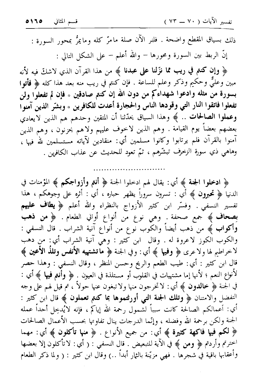 وَإِنْ كُنْتُمْ فِي رَيْبٍ مِمَّا نَزَّلْنا عَلى عَبْدِنا من هذا القرآن الذي لا شكّ فيه لأنه مبين وعليّ وحكيم وذكر وعلم للساعة. فإن كنتم في ريب منه بعد هذا كله فَأْتُوا بِسُورَةٍ مِنْ مِثْلِهِ وَادْعُوا شُهَداءَكُمْ مِنْ دُونِ اللَّهِ إِنْ كُنْتُمْ صادِقِينَ* فَإِنْ لَمْ تَفْعَلُوا وَلَنْ تَفْعَلُوا فَاتَّقُوا النَّارَ الَّتِي وَقُودُهَا النَّاسُ وَالْحِجارَةُ أُعِدَّتْ لِلْكافِرِينَ* وَبَشِّرِ الَّذِينَ آمَنُوا وَعَمِلُوا الصَّالِحاتِ .. وهذا السياق يحدّثنا أن المتقين وحدهم هم الذين لا يعادي بعضهم بعضا يوم القيامة. وهم الذين لا خوف عليهم ولا هم يحزنون، وهم الذين آمنوا بالقرآن فلم يرتابوا وكانوا مسلمين أي: منقادين لآياته مستسلمين لله فيها، وها هي ذي سورة الزخرف تبشّرهم، ثمّ تعود للحديث عن عذاب الكافرين.