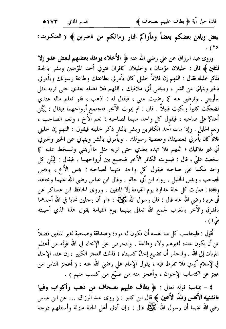 وروى عبد الرزاق عن علي رضي الله عنه الْأَخِلَّاءُ يَوْمَئِذٍ بَعْضُهُمْ لِبَعْضٍ عَدُوٌّ إِلَّا الْمُتَّقِينَ قال: خليلان مؤمنان، وخليلان كافران فتوفي أحد المؤمنين وبشر بالجنة فذكر خليله فقال: اللهم إن فلانا خليلي كان يأمرني بطاعتك وطاعة رسولك ويأمرني بالخير وينهاني عن الشر، وينبئني أني ملاقيك، اللهم فلا تضله بعدي حتى تريه مثل ما أريتني. وترضى عنه كما رضيت عني، فيقال له: اذهب، فلو تعلم ما له عندي لضحكت كثيرا وبكيت قليلا. قال: ثم يموت الآخر فتجتمع أرواحهما فيقال: ليثن أحدكما على صاحبه، فيقول كل واحد منهما لصاحبه: نعم الأخ، ونعم الصاحب، ونعم الخليل. وإذا مات أحد الكافرين وبشر بالنار ذكر خليله فيقول: اللهم إن خليلي فلانا كان يأمرني بمعصيتك ومعصية رسولك. ويأمرني بالشر وينهاني عن الخير ويخبرني أني غير ملاقيك؛ اللهم فلا تهده بعدي حتى تريه مثل ما أريتني وتسخط عليه كما سخطت عليّ، قال: فيموت الكافر الآخر فيجمع بين أرواحهما. فيقال: ليثن كل واحد منكما على صاحبه فيقول كل واحد منهما لصاحبه: بئس الأخ، وبئس الصاحب، وبئس الخليل. رواه ابن أبي حاتم. وقال ابن عباس رضي الله عنهما ومجاهد وقتادة: صارت كل خلة عداوة يوم القيامة إلا المتقين. وروى الحافظ ابن عساكر عن أبي هريرة رضي الله عنه قال: قال رسول الله صلّى الله عليه وسلم: «لو أن رجلين تحابا في الله أحدهما بالمشرق والآخر بالمغرب لجمع الله تعالى بينهما يوم القيامة يقول هذا الذي أحببته فيّ»).