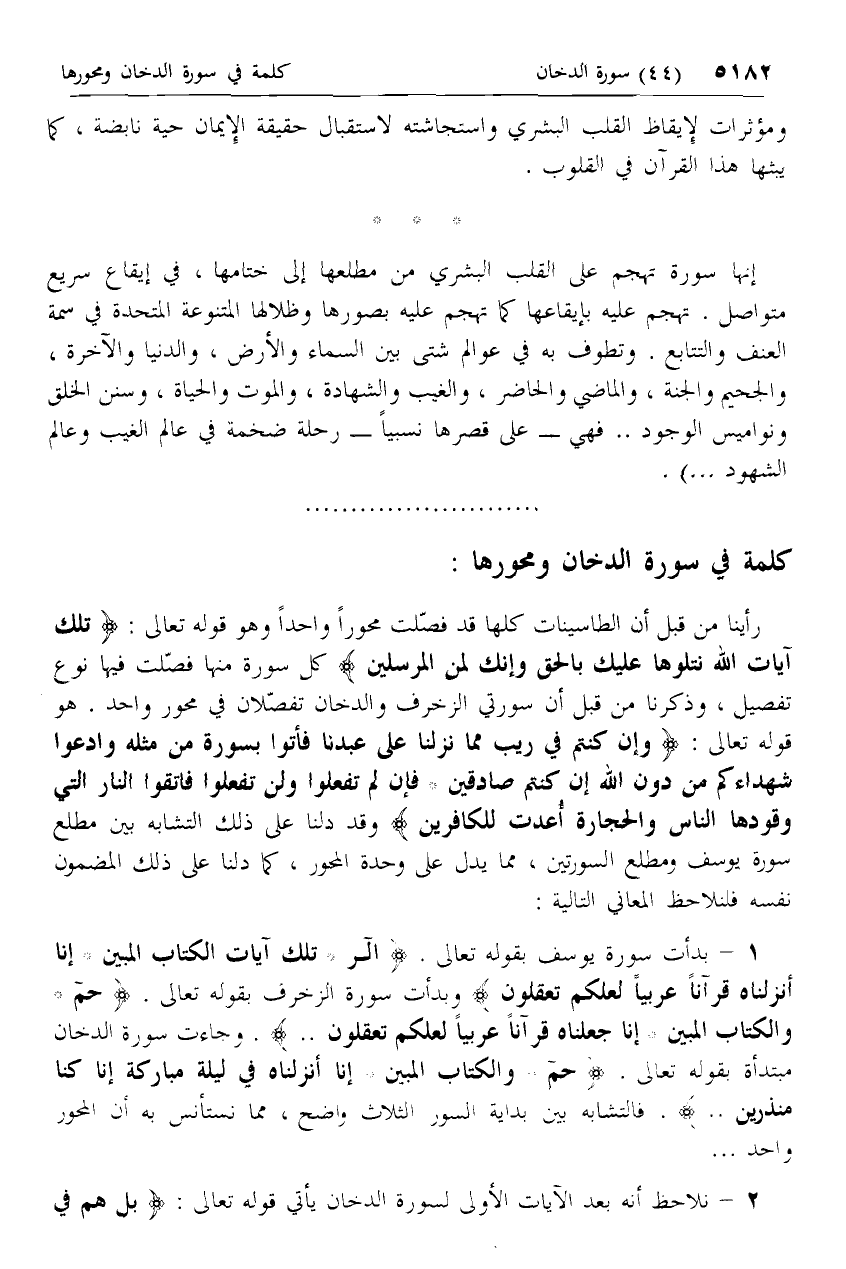 رأينا من قبل أن الطاسينات كلها قد فصّلت محورا واحدا وهو قوله تعالى: تِلْكَ آياتُ اللَّهِ نَتْلُوها عَلَيْكَ بِالْحَقِّ وَإِنَّكَ لَمِنَ الْمُرْسَلِينَ كل سورة منها فصّلت فيها نوع تفصيل، وذكرنا من قبل أن سورتي الزخرف والدخان تفصّلان في محور واحد. هو قوله تعالى: وَإِنْ كُنْتُمْ فِي رَيْبٍ مِمَّا نَزَّلْنا عَلى عَبْدِنا فَأْتُوا بِسُورَةٍ مِنْ مِثْلِهِ وَادْعُوا شُهَداءَكُمْ مِنْ دُونِ اللَّهِ إِنْ كُنْتُمْ صادِقِينَ* فَإِنْ لَمْ تَفْعَلُوا وَلَنْ تَفْعَلُوا فَاتَّقُوا النَّارَ الَّتِي وَقُودُهَا النَّاسُ وَالْحِجارَةُ أُعِدَّتْ لِلْكافِرِينَ وقد دلنا على ذلك التشابه بين مطلع سورة يوسف ومطلع السورتين، مما يدل على وحدة المحور، كما دلنا على ذلك المضمون نفسه فلنلاحظ المعاني التالية: