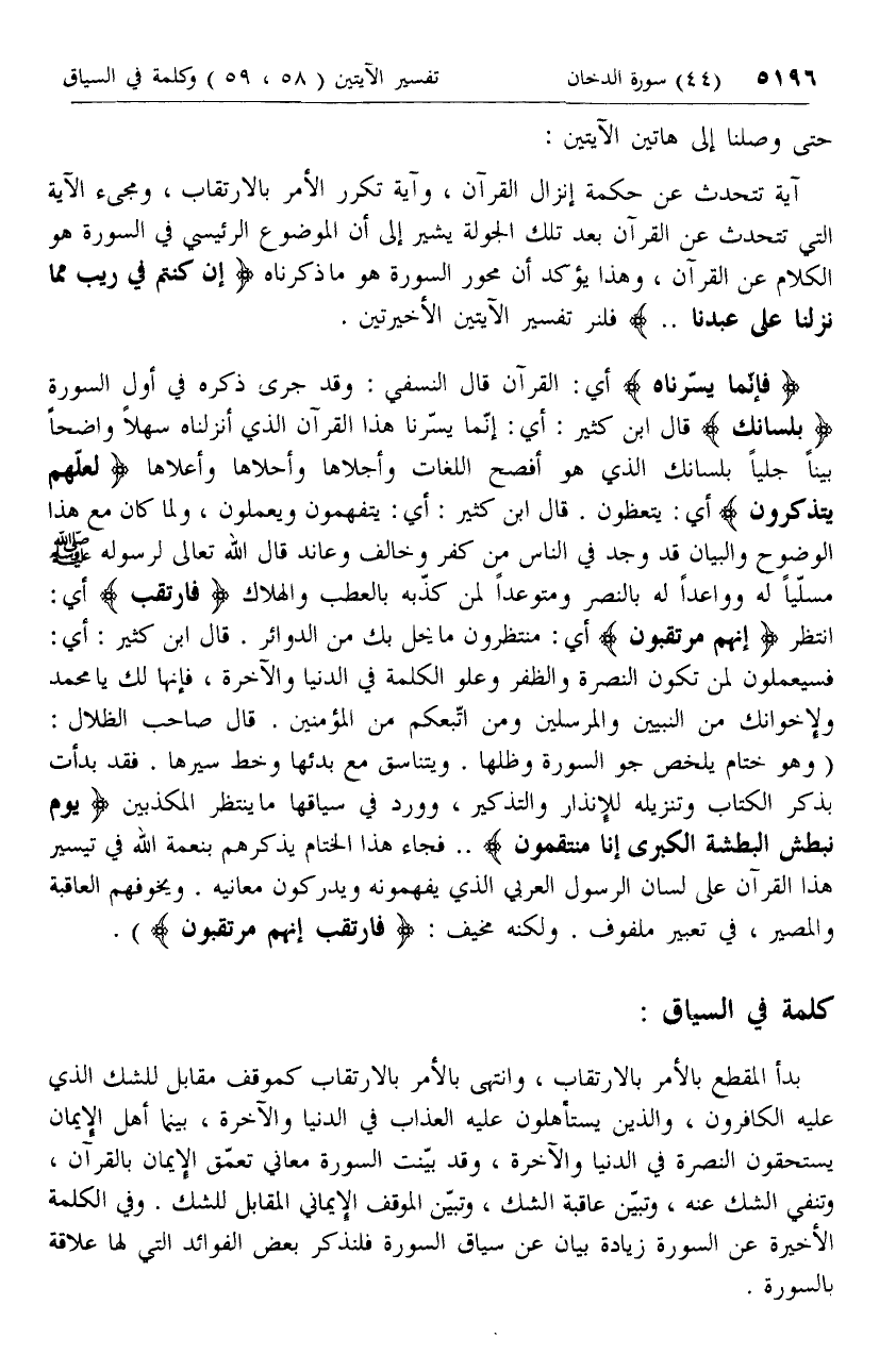 (وهو ختام يلخص جو السورة وظلها. ويتناسق مع بدئها وخط سيرها. فقد بدأت بذكر الكتاب وتنزيله للإنذار والتذكير، وورد في سياقها ما ينتظر المكذبين يَوْمَ نَبْطِشُ الْبَطْشَةَ الْكُبْرى إِنَّا مُنْتَقِمُونَ .. فجاء هذا الختام يذكرهم بنعمة الله في تيسير هذا القرآن على لسان الرسول العربي الذي يفهمونه ويدركون معانيه. ويخوفهم العاقبة والمصير، في تعبير ملفوف. ولكنه مخيف: فَارْتَقِبْ إِنَّهُمْ مُرْتَقِبُونَ).