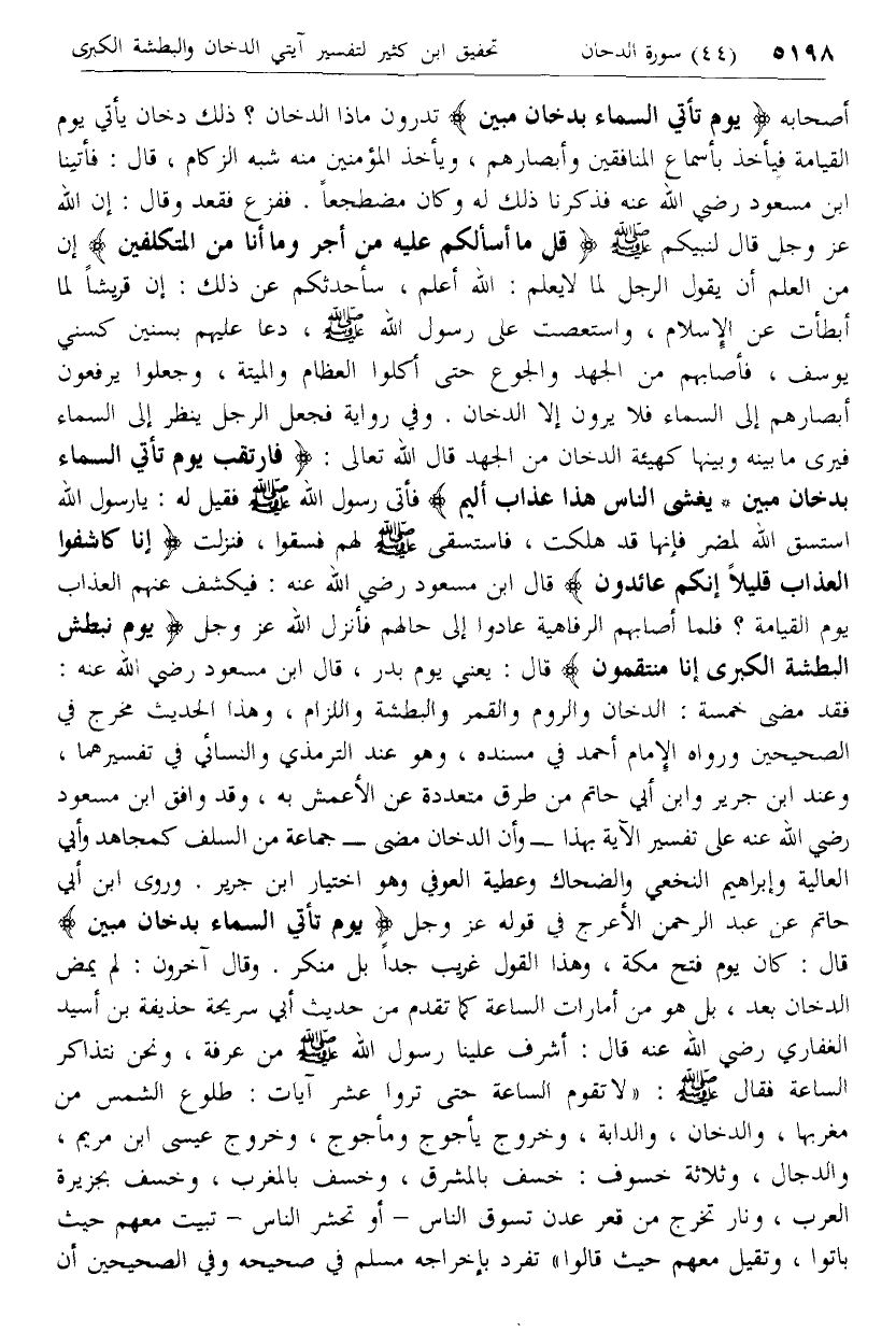 أصحابه يَوْمَ تَأْتِي السَّماءُ بِدُخانٍ مُبِينٍ تدرون ماذا الدخان؟ ذلك دخان يأتي يوم القيامة فيأخذ بأسماع المنافقين وأبصارهم، ويأخذ المؤمنين منه شبه الزكام، قال: فأتينا ابن مسعود رضي الله عنه فذكرنا ذلك له وكان مضطجعا. ففزع فقعد وقال: إن الله عزّ وجل قال لنبيكم صلّى الله عليه وسلم قُلْ ما أَسْئَلُكُمْ عَلَيْهِ مِنْ أَجْرٍ وَما أَنَا مِنَ الْمُتَكَلِّفِينَ إن من العلم أن يقول الرجل لما لا يعلم: الله أعلم، سأحدثكم عن ذلك: إن قريشا لما أبطأت عن الإسلام، واستعصت على رسول الله صلّى الله عليه وسلم، دعا عليهم بسنين كسني يوسف، فأصابهم من الجهد والجوع حتى أكلوا العظام والميتة، وجعلوا يرفعون أبصارهم إلى السماء فلا يرون إلا الدخان. وفي رواية فجعل الرجل ينظر إلى السماء فيرى ما بينه وبينها كهيئة الدخان من الجهد قال الله تعالى: فَارْتَقِبْ يَوْمَ تَأْتِي السَّماءُ بِدُخانٍ مُبِينٍ* يَغْشَى النَّاسَ هذا عَذابٌ أَلِيمٌ فأتى رسول الله صلّى
