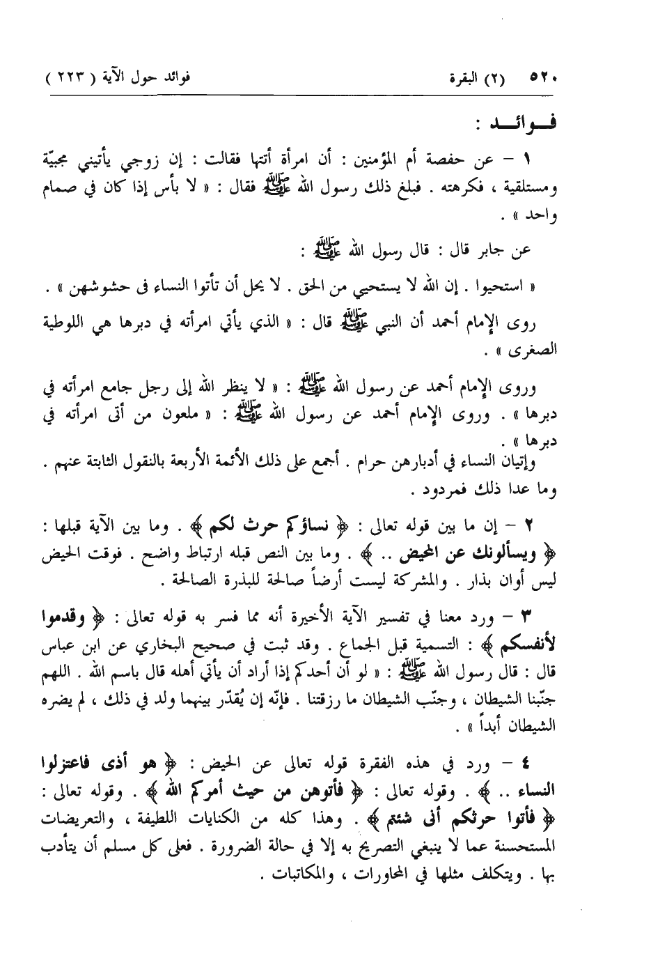 4 - ورد في هذه الفقرة قوله تعالى عن الحيض: هُوَ أَذىً فَاعْتَزِلُوا النِّساءَ ... وقوله تعالى: فَأْتُوهُنَّ مِنْ حَيْثُ أَمَرَكُمُ اللَّهُ. وقوله تعالى: