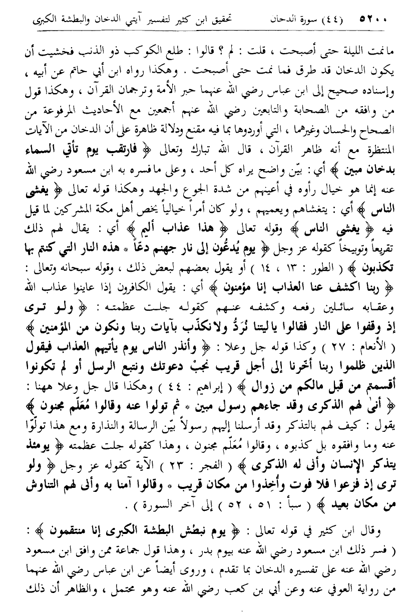 ما نمت الليلة حتى أصبحت، قلت: لم؟ قالوا: طلع الكوكب ذو الذنب فخشيت أن يكون الدخان قد طرق فما نمت حتى أصبحت. وهكذا رواه ابن أبي حاتم عن أبيه، وإسناده صحيح إلى ابن عباس رضي الله عنهما حبر الأمة وترجمان القرآن، وهكذا قول من وافقه من الصحابة والتابعين رضي الله عنهم أجمعين مع الأحاديث المرفوعة من الصحاح والحسان وغيرهما، التي أوردوها بما فيه مقنع ودلالة ظاهرة على أن الدخان من الآيات المنتظرة مع أنه ظاهر القرآن، قال الله تبارك وتعالى فَارْتَقِبْ يَوْمَ تَأْتِي السَّماءُ بِدُخانٍ مُبِينٍ أي: بيّن واضح يراه كل أحد، وعلى ما فسره به ابن مسعود رضي الله عنه إنما هو خيال رأوه في أعينهم من شدة الجوع والجهد وهكذا قوله تعالى يَغْشَى النَّاسَ أي: يتغشاهم ويعميهم، ولو كان أمرا خياليا يخص أهل مكة المشركين لما قيل فيه يَغْشَى النَّاسَ وقوله تعالى هذا عَذابٌ أَلِيمٌ أي: يقال لهم ذلك تقريعا وتوبيخا كقوله عزّ وجل يَوْمَ يُدَعُّونَ إِلى نارِ جَهَنَّمَ دَعًّا* هذِهِ النَّارُ الَّتِي كُنْتُمْ بِها تُكَذِّبُونَ (الطور: 13، 14) أو يقول بعضهم لبعض ذلك، وقوله سبحانه وتعالى: