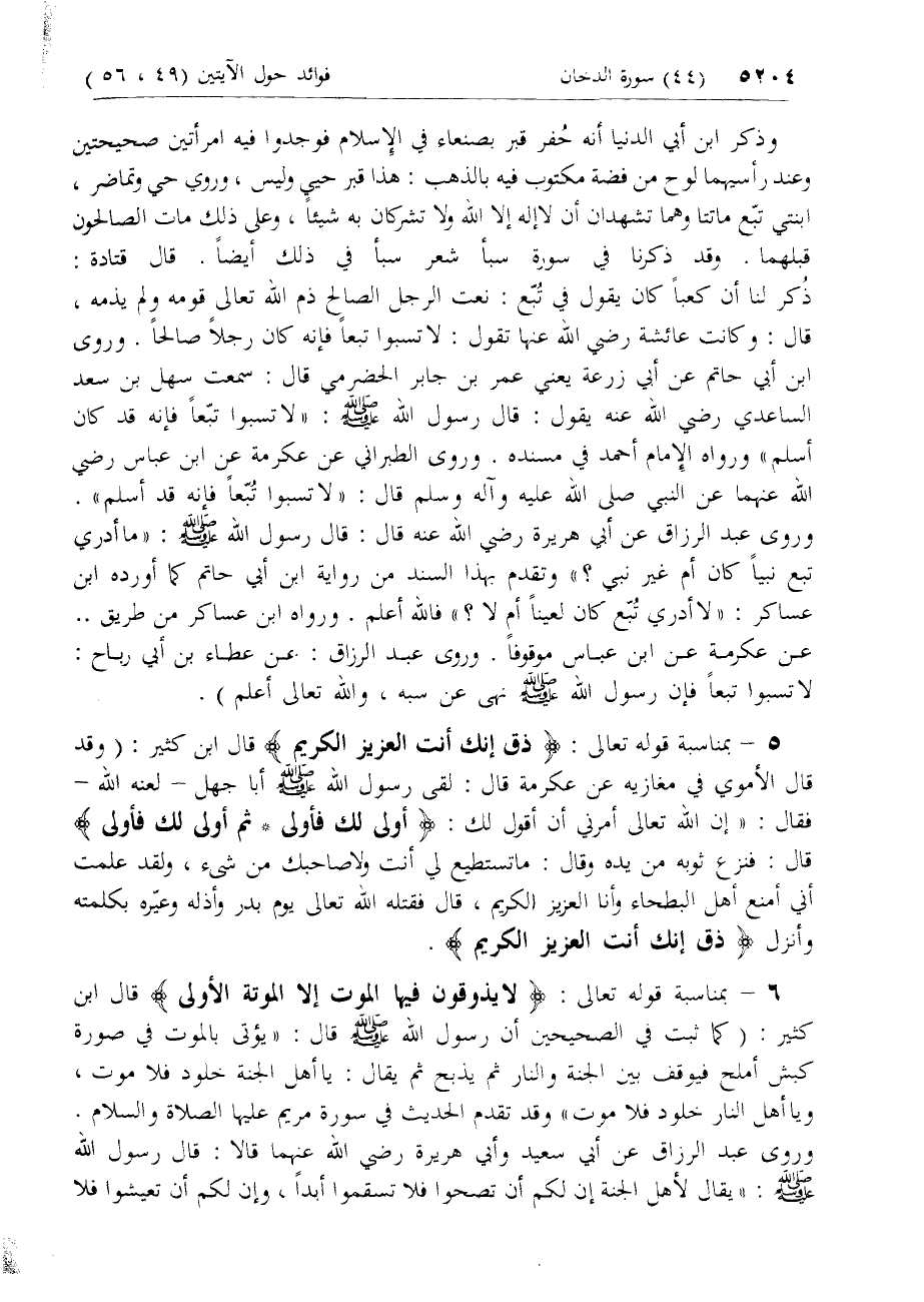 بمناسبة قوله تعالى: لا يَذُوقُونَ فِيهَا الْمَوْتَ إِلَّا الْمَوْتَةَ الْأُولى قال ابن كثير: (كما ثبت في الصحيحين أن رسول الله صلّى الله عليه وسلم قال: «يؤتى بالموت في صورة كبش أملح فيوقف بين الجنة والنار ثم يذبح ثم يقال: يا أهل الجنة خلود فلا موت، ويا أهل النار خلود فلا موت» وقد تقدم الحديث في سورة مريم عليها الصلاة والسلام.
