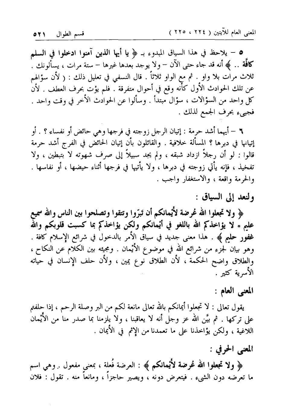 وَلا تَجْعَلُوا اللَّهَ عُرْضَةً لِأَيْمانِكُمْ أَنْ تَبَرُّوا وَتَتَّقُوا وَتُصْلِحُوا بَيْنَ النَّاسِ وَاللَّهُ سَمِيعٌ عَلِيمٌ* لا يُؤاخِذُكُمُ اللَّهُ بِاللَّغْوِ فِي أَيْمانِكُمْ وَلكِنْ يُؤاخِذُكُمْ بِما كَسَبَتْ قُلُوبُكُمْ وَاللَّهُ غَفُورٌ حَلِيمٌ. هذا معنى جديد في سياق الأمر بالدخول في شرائع الإسلام كافة.