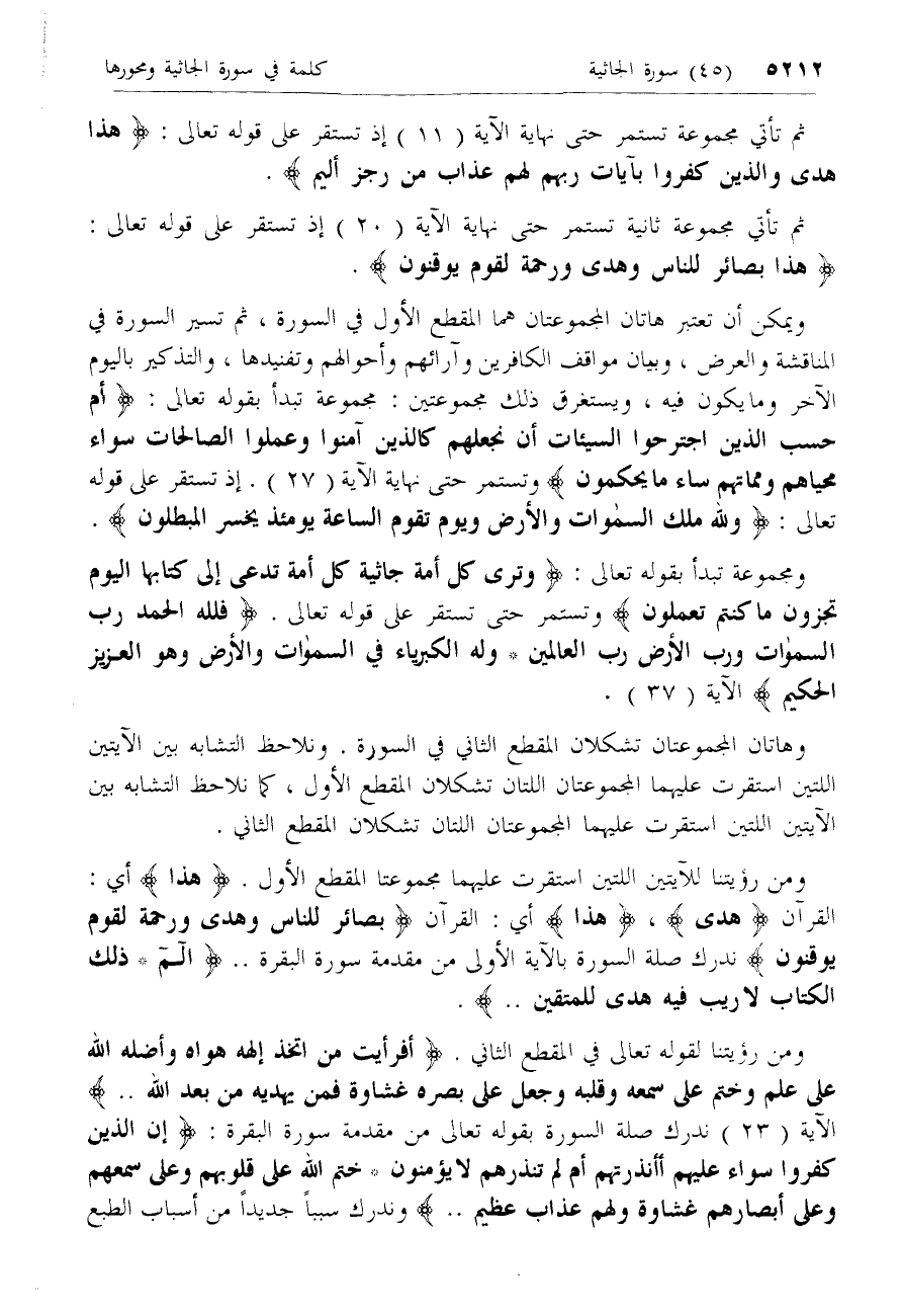 ومجموعة تبدأ بقوله تعالى: وَتَرى كُلَّ أُمَّةٍ جاثِيَةً كُلُّ أُمَّةٍ تُدْعى إِلى كِتابِهَا الْيَوْمَ تُجْزَوْنَ ما كُنْتُمْ تَعْمَلُونَ وتستمر حتى تستقر على قوله تعالى. فَلِلَّهِ الْحَمْدُ رَبِّ السَّماواتِ وَرَبِّ الْأَرْضِ رَبِّ الْعالَمِينَ* وَلَهُ الْكِبْرِياءُ فِي السَّماواتِ وَالْأَرْضِ وَهُوَ الْعَزِيزُ الْحَكِيمُ الآية (37).