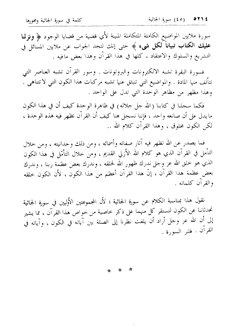 نقول هذا بمناسبة الكلام عن سورة الجاثية؛ لأن المجموعتين الأوليين في سورة الجاثية تحدثاننا عن الكون لتستقر كل منهما على ذكر خاصية من خواص هذا القرآن، مما يشير إلى أن الله عزّ وجل أراد أن يلفت نظرنا إلى الصلة بين آياته في الكون، وآياته في القرآن. فلنر السورة.