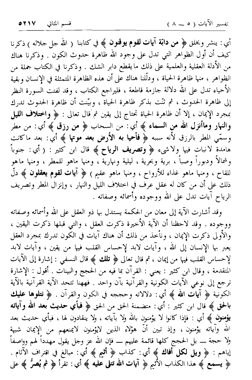 أي: ينشر ويخلق مِنْ دابَّةٍ آياتٌ لِقَوْمٍ يُوقِنُونَ في كتابنا (الله جل جلاله) ذكرنا كيف أن أول الظواهر التي تدل على وجود الله ظاهرة حدوث الكون. وذكرنا هناك من الأدلة العقلية والعلمية على ذلك ما يقطع دابر الشك. وذكرنا في الكتاب جملة من الظواهر، منها ظاهرة الحياة، ودلّلنا هناك على أن هذه الظاهرة المتمثلة في الإنسان وبقية الأحياء تدل على الله دلالة جازمة قاطعة، فليراجع الكتاب، وقد لفتت السورة النظر إلى ظاهرة الحدوث،