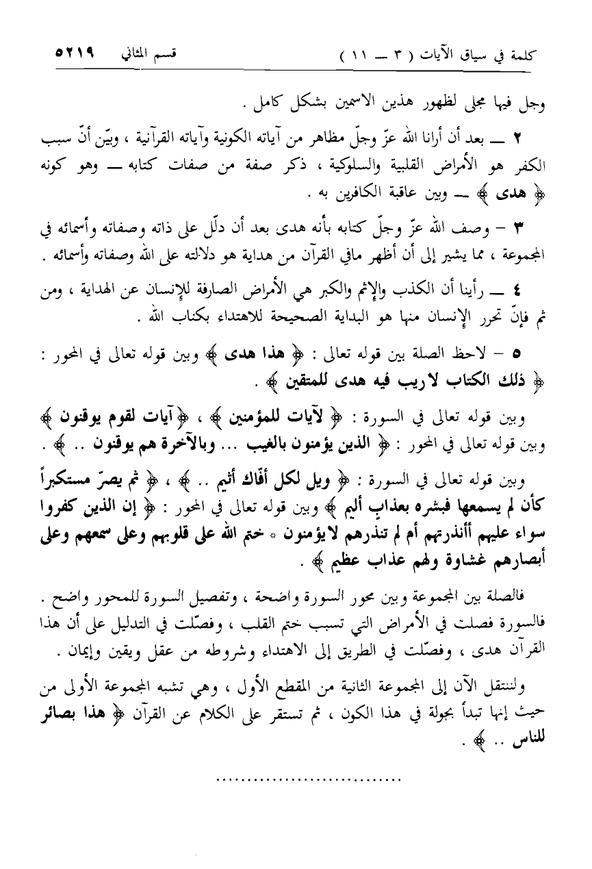 2 - بعد أن أرانا الله عزّ وجلّ مظاهر من آياته الكونية وآياته القرآنية، وبيّن أنّ سبب الكفر هو الأمراض القلبية والسلوكية، ذكر صفة من صفات كتابه- وهو كونه هُدىً- وبين عاقبة الكافرين به.
