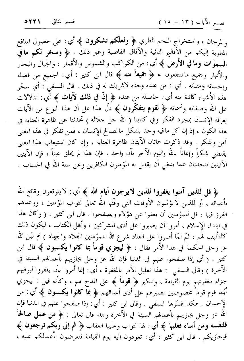 وَسَخَّرَ لَكُمْ ما فِي السَّماواتِ وَما فِي الْأَرْضِ أي: من الكواكب والشموس والأقمار، والجبال والبحار والأنهار وجميع ما تنتفعون به جَمِيعاً مِنْهُ قال ابن كثير: أي: الجميع من فضله وإحسانه وامتنانه. أي: من عنده وحده لا شريك له في ذلك. قال النسفي: أي سخّر هذه الأشياء كائنة منه أي: حاصلة من عنده إِنَّ فِي ذلِكَ لَآياتٍ أي: لدلالات على الله وصفاته وأسمائه لِقَوْمٍ يَتَفَكَّرُونَ دلّ هذا على أن هذا النوع من الآيات يعرفه الإنسان بمجرد الفكر وفي كتابنا (الله جل جلاله) تحدثنا عن ظاهرة العناية في هذا الكون، إذ إن كل ما فيه وجد بشكل ما لصالح الإنسان، فمن تفكر في هذا المعنى آمن وشكر. وقد ذكرت هاتان الآيتان ظاهرة العناية، وإذا كان استيعاب هذا المعنى يقتضي شكرا وإيمانا بالله واليوم الآخر بآن واحد، فإن هذا لم يخلق عبثا، فإن الآيتين الآتيتين تتحدثان عما ينبغي أن يقابل به المؤمنون الكافرين وعن سنة الله في