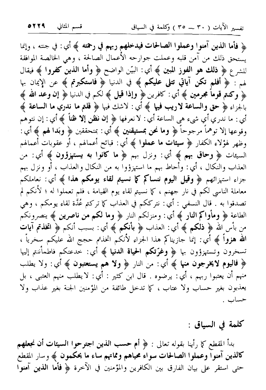 بدأ المقطع كما رأينا بقوله تعالى: أَمْ حَسِبَ الَّذِينَ اجْتَرَحُوا السَّيِّئاتِ أَنْ نَجْعَلَهُمْ كَالَّذِينَ آمَنُوا وَعَمِلُوا الصَّالِحاتِ سَواءً مَحْياهُمْ وَمَماتُهُمْ ساءَ ما يَحْكُمُونَ وسار المقطع حتى استقر على بيان الفارق بين الكافرين والمؤمنين في الآخرة فَأَمَّا الَّذِينَ آمَنُوا