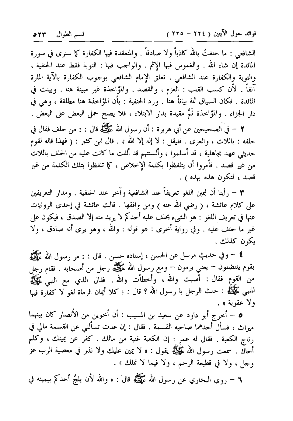 الشافعي: ما حلفت بالله كاذبا ولا صادقا. والمنعقدة فيها الكفارة كما سنرى في سورة المائدة إن شاء الله. والغموس فيها الإثم. والواجب فيها: التوبة فقط عند الحنفية، والتوبة والكفارة عند الشافعي. تعلق الإمام الشافعي بوجوب الكفارة بالآية المارة آنفا. لأن كسب القلب: العزم، والقصد. والمؤاخذة غير مبينة هنا. وبينت في المائدة. فكان السياق ثمة بيانا هنا. ورد الحنفية: بأن المؤاخذة هنا مطلقة، وهي في دار الجزاء. والمؤاخذة ثم مقيدة بدار الابتلاء، فلا يصح حمل البعض على البعض.