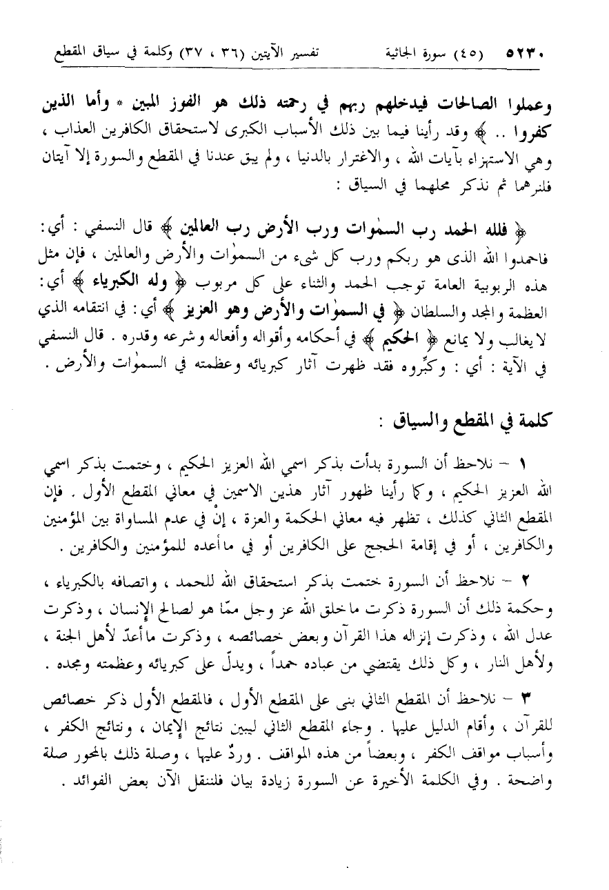 2 - نلاحظ أن السورة ختمت بذكر استحقاق الله للحمد، واتصافه بالكبرياء، وحكمة ذلك أن السورة ذكرت ما خلق الله عزّ وجل ممّا هو لصالح الإنسان، وذكرت عدل الله، وذكرت إنزاله هذا القرآن وبعض خصائصه، وذكرت ما أعدّ لأهل الجنة، ولأهل النار، وكل ذلك يقتضي من عباده حمدا، ويدلّ على كبريائه وعظمته ومجده.