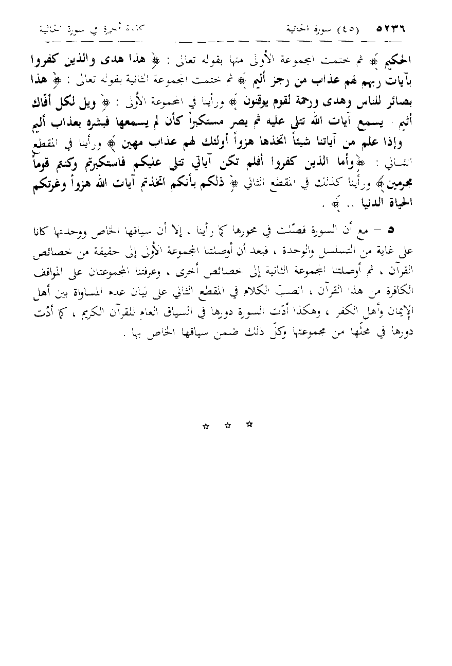 الْحَكِيمِ ثم ختمت المجموعة الأولى منها بقوله تعالى: هذا هُدىً وَالَّذِينَ كَفَرُوا بِآياتِ رَبِّهِمْ لَهُمْ عَذابٌ مِنْ رِجْزٍ أَلِيمٌ ثم ختمت المجموعة الثانية بقوله تعالى: هذا بَصائِرُ لِلنَّاسِ وَهُدىً وَرَحْمَةٌ لِقَوْمٍ يُوقِنُونَ ورأينا في المجموعة الأولى: وَيْلٌ لِكُلِّ أَفَّاكٍ أَثِيمٍ* يَسْمَعُ آياتِ اللَّهِ تُتْلى عَلَيْهِ ثُمَّ يُصِرُّ مُسْتَكْبِراً كَأَنْ لَمْ يَسْمَعْها فَبَشِّرْهُ بِعَذابٍ أَلِيمٍ* وَإِذا عَلِمَ مِنْ آياتِنا شَيْئاً اتَّخَذَها هُزُواً أُولئِكَ لَهُمْ عَذابٌ مُهِينٌ ورأينا في المقطع الثاني: وَأَمَّا الَّذِينَ كَفَرُوا أَفَلَمْ تَكُنْ آياتِي تُتْلى عَلَيْكُمْ فَاسْتَكْبَرْتُمْ وَكُنْتُمْ قَوْماً مُجْرِمِينَ ورأينا كذلك في المقطع الثاني ذلِكُمْ بِأَنَّكُمُ اتَّخَذْتُمْ آياتِ اللَّهِ هُزُواً وَغَرَّتْكُمُ الْحَياةُ الدُّنْيا ...