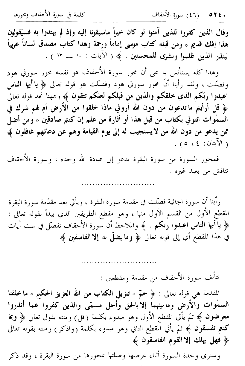 وهذا كله يستأنس به على أن محور سورة الأحقاف هو نفسه محور سورتي هود وفصّلت، ولقد رأينا أنّ محور سورتي هود وفصّلت هو قوله تعالى يا أَيُّهَا النَّاسُ اعْبُدُوا رَبَّكُمُ الَّذِي خَلَقَكُمْ وَالَّذِينَ مِنْ قَبْلِكُمْ لَعَلَّكُمْ تَتَّقُونَ وهاهنا نجد قوله تعالى قُلْ أَرَأَيْتُمْ ما تَدْعُونَ مِنْ دُونِ اللَّهِ أَرُونِي ماذا خَلَقُوا مِنَ الْأَرْضِ أَمْ لَهُمْ شِرْكٌ فِي السَّماواتِ ائْتُونِي بِكِتابٍ مِنْ قَبْلِ هذا أَوْ أَثارَةٍ مِنْ عِلْمٍ إِنْ كُنْتُمْ صادِقِينَ* وَمَنْ أَضَلُّ مِمَّنْ يَدْعُوا مِنْ دُونِ اللَّهِ مَنْ لا يَسْتَجِيبُ لَهُ إِلى يَوْمِ الْقِيامَةِ وَهُمْ عَنْ دُعائِهِمْ غافِلُونَ (الآيتان: 4، 5).