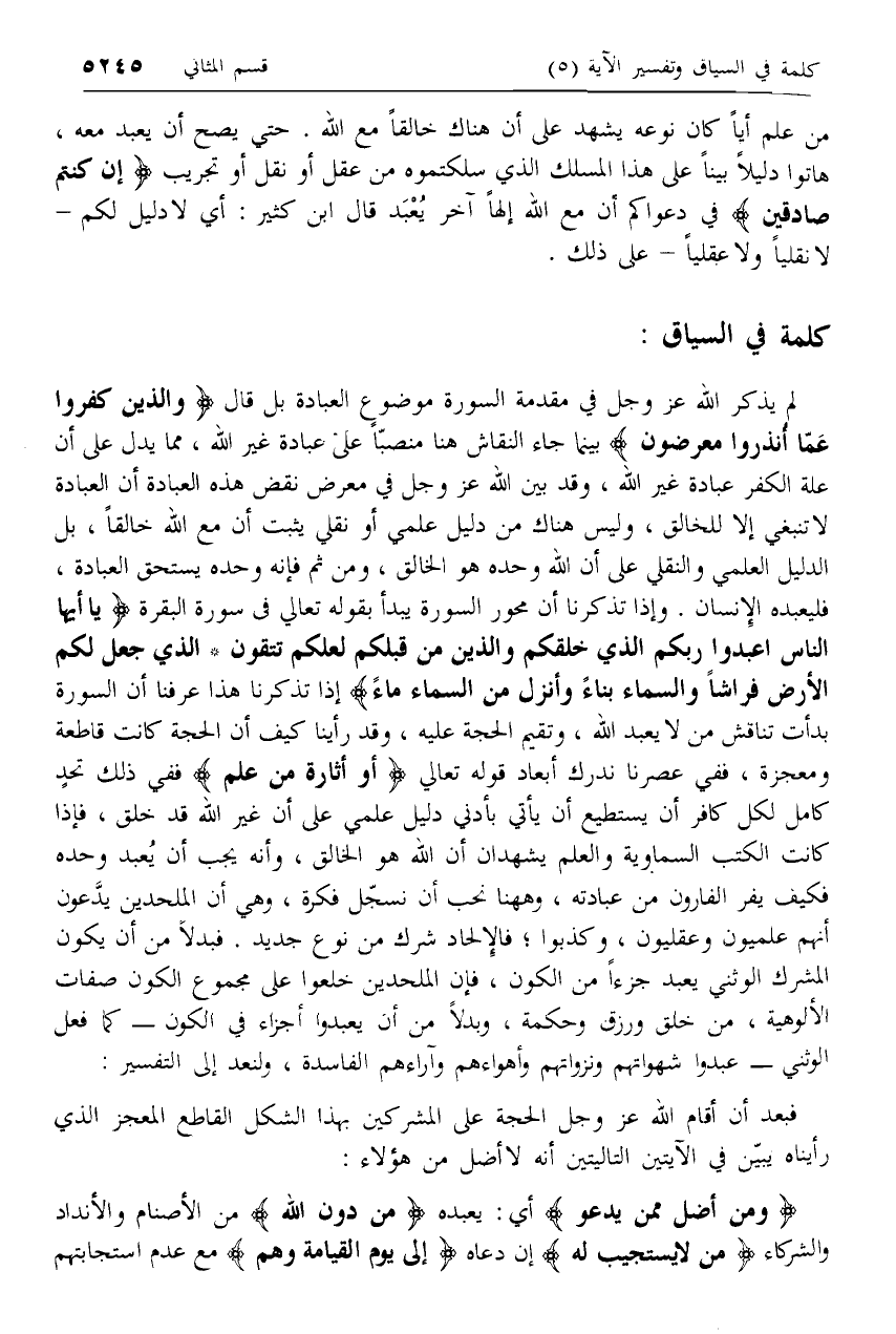 البقرة يا أَيُّهَا النَّاسُ اعْبُدُوا رَبَّكُمُ الَّذِي خَلَقَكُمْ وَالَّذِينَ مِنْ قَبْلِكُمْ لَعَلَّكُمْ تَتَّقُونَ* الَّذِي جَعَلَ لَكُمُ الْأَرْضَ فِراشاً وَالسَّماءَ بِناءً وَأَنْزَلَ مِنَ السَّماءِ ماءً إذا تذكرنا هذا عرفنا أن السورة بدأت تناقش من لا يعبد الله، وتقيم الحجة عليه، وقد رأينا كيف أن الحجة كانت قاطعة ومعجزة، ففي عصرنا ندرك أبعاد قوله تعالي أَوْ أَثارَةٍ مِنْ عِلْمٍ ففي ذلك تحد كامل لكل كافر أن يستطيع أن يأتي بأدنى دليل علمي على أن غير الله قد خلق، فإذا كانت الكتب السماوية والعلم يشهدان أن الله هو الخالق، وأنه يجب أن يعبد وحده فكيف يفر الفارون من عبادته، وهاهنا نحب أن نسجّل فكرة، وهي أن الملحدين يدّعون أنهم علميون وعقليون، وكذبوا؛ فالإلحاد شرك من نوع جديد. فبدلا من أن يكون المشرك الوثني يعبد جزءا من الكون، فإن الملحدين خلعوا على مجموع الكون صفات الألوهية، من خلق ورزق وحكمة، وبدلا من أن يعبدوا أجزاء في الكون- كما فعل الوثني- عبدوا شهواتهم ونزواتهم وأهواءهم وآراءهم الفاسدة، ولنعد إلى التفسير: