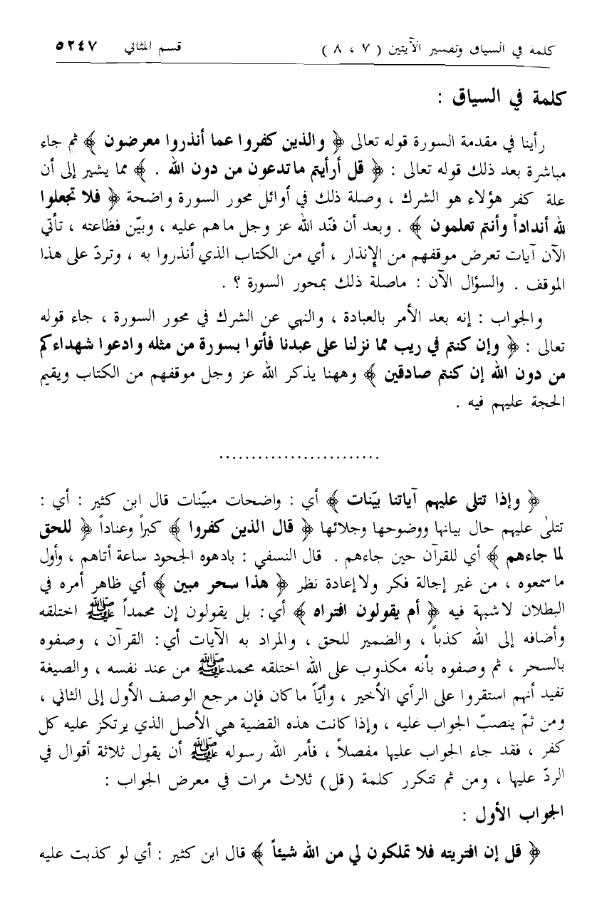والجواب: إنه بعد الأمر بالعبادة، والنهي عن الشرك في محور السورة، جاء قوله تعالى: وَإِنْ كُنْتُمْ فِي رَيْبٍ مِمَّا نَزَّلْنا عَلى عَبْدِنا فَأْتُوا بِسُورَةٍ مِنْ مِثْلِهِ وَادْعُوا شُهَداءَكُمْ مِنْ دُونِ اللَّهِ إِنْ كُنْتُمْ صادِقِينَ وهاهنا يذكر الله عزّ وجل موقفهم من الكتاب ويقيم الحجة عليهم فيه.
