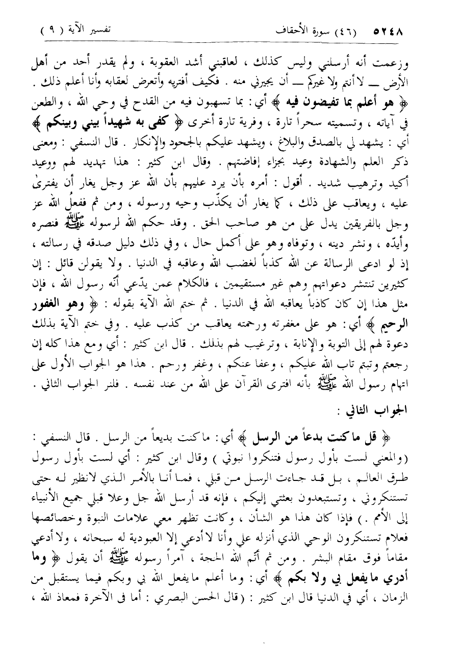 هُوَ أَعْلَمُ بِما تُفِيضُونَ فِيهِ أي: بما تسهبون فيه من القدح في وحي الله، والطعن في آياته، وتسميته سحرا تارة، وفرية تارة أخرى كَفى بِهِ شَهِيداً بَيْنِي وَبَيْنَكُمْ أي: يشهد لي بالصدق والبلاغ، ويشهد عليكم بالجحود والإنكار. قال النسفي: ومعنى ذكر العلم والشهادة وعيد بجزاء إفاضتهم. وقال ابن كثير: هذا تهديد لهم ووعيد أكيد وترهيب شديد. أقول: أمره بأن يرد عليهم بأن الله عزّ وجل يغار أن يفترى عليه، ويعاقب على ذلك، كما يغار أن يكذّب وحيه ورسوله، ومن ثم ففعل الله عزّ وجل بالفريقين يدل على من هو صاحب الحق. وقد حكم الله لرسوله صلّى الله عليه وسلم فنصره وأيّده، ونشر دينه، وتوفاه وهو على أكمل حال، وفي ذلك دليل صدقه في رسالته، إذ لو ادعى الرسالة عن الله كذبا لغضب الله وعاقبه في الدنيا. ولا يقولن قائل: إن كثيرين تنتشر دعواتهم وهم غير مستقيمين، فالكلام عمن يدّعي أنّه رسول الله، فإن مثل هذا إن كان كاذبا يعاقبه الله في الدنيا. ثم ختم الله الآية بقوله: وَهُوَ الْغَفُورُ الرَّحِيمُ أي: هو على مغفرته ورحمته يعاقب من كذب عليه. وفي ختم الآية بذلك دعوة لهم إلى التوبة والإنابة، وترغيب لهم بذلك. قال ابن كثير: أي ومع هذا كله إن رجعتم وتبتم تاب الله عليكم، وعفا عنكم، وغفر ورحم. هذا هو الجواب الأول على اتهام رسول الله صلّى الله عليه وسلم بأنه افترى القرآن على الله من عند نفسه. فلنر الجواب الثاني.