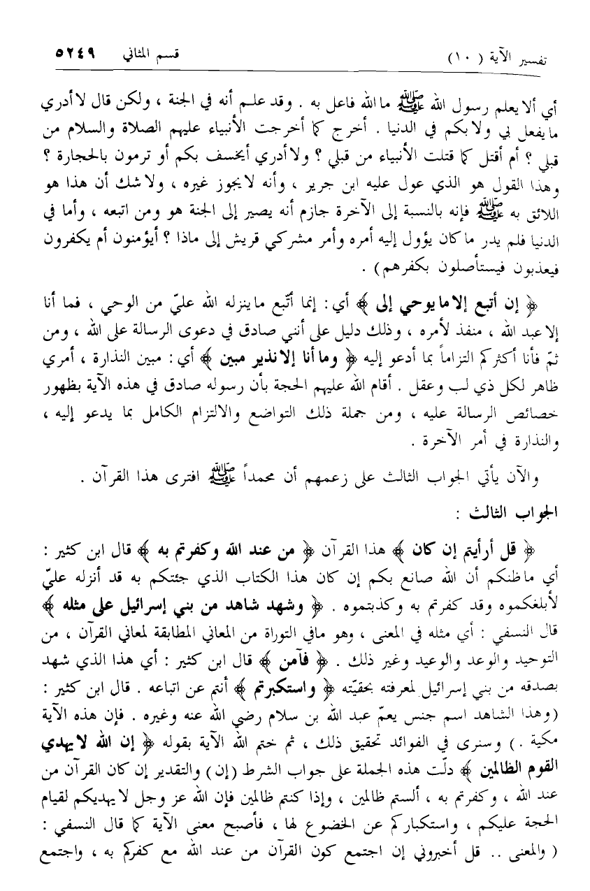 (وهذا الشاهد اسم جنس يعمّ عبد الله بن سلام رضي الله عنه وغيره. فإن هذه الآية مكية.) وسنرى في الفوائد تحقيق ذلك، ثم ختم الله الآية بقوله إِنَّ اللَّهَ لا يَهْدِي الْقَوْمَ الظَّالِمِينَ دلّت هذه الجملة على جواب الشرط (إن) والتقدير إن كان القرآن من عند الله، وكفرتم به، ألستم ظالمين، وإذا كنتم ظالمين فإن الله عزّ وجل لا يهديكم لقيام الحجة عليكم، واستكباركم عن الخضوع لها، فأصبح معنى الآية كما قال النسفي: