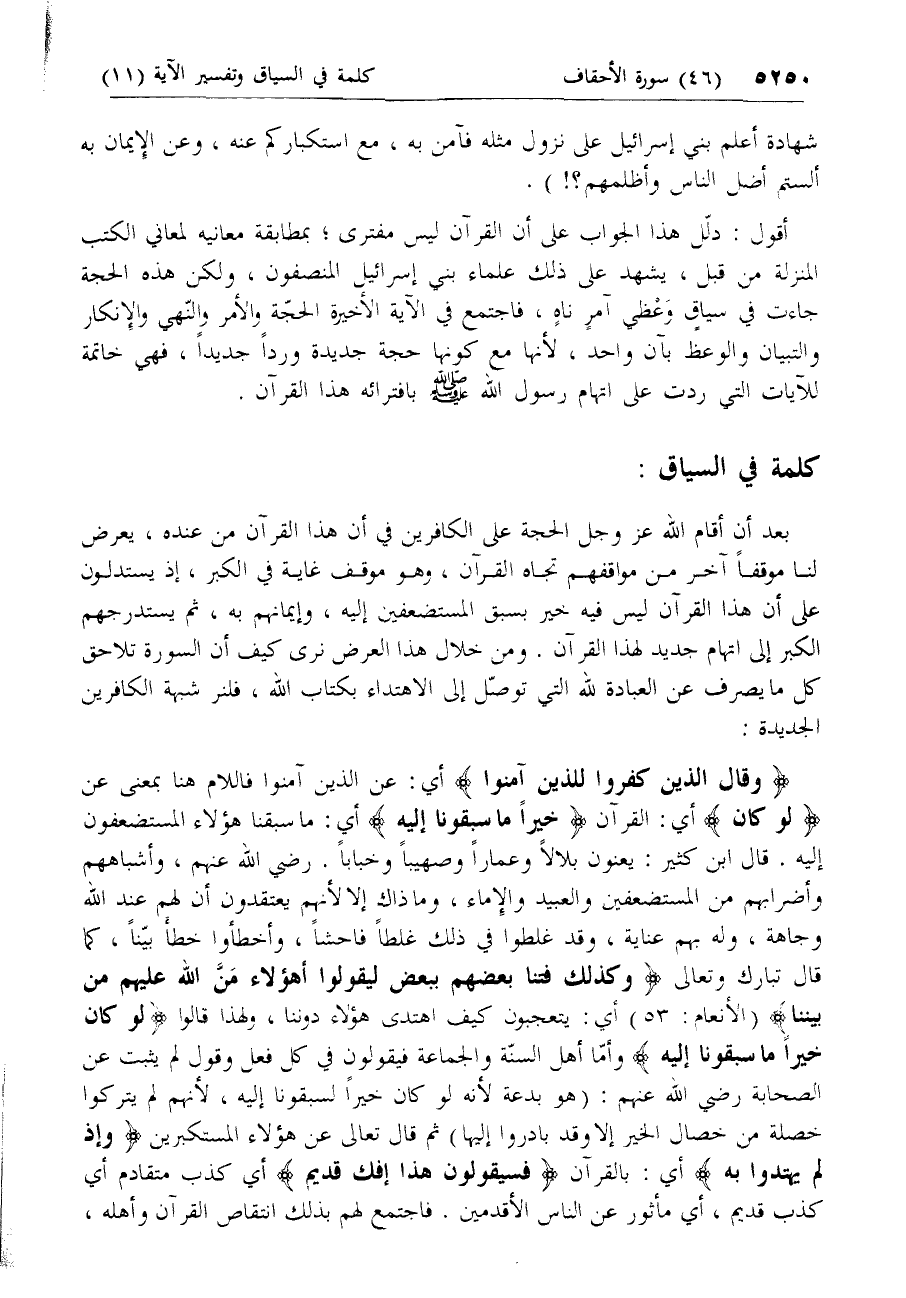 بعد أن أقام الله عزّ وجل الحجة على الكافرين في أن هذا القرآن من عنده، يعرض لنا موقفا آخر من مواقفهم تجاه القرآن، وهو موقف غاية في الكبر، إذ يستدلون على أن هذا القرآن ليس فيه خير بسبق المستضعفين إليه، وإيمانهم به، ثم يستدرجهم الكبر إلى اتهام جديد لهذا القرآن. ومن خلال هذا العرض نرى كيف أن السورة تلاحق كل ما يصرف عن العبادة لله التي توصّل إلى الاهتداء بكتاب الله، فلنر شبهة الكافرين الجديدة: