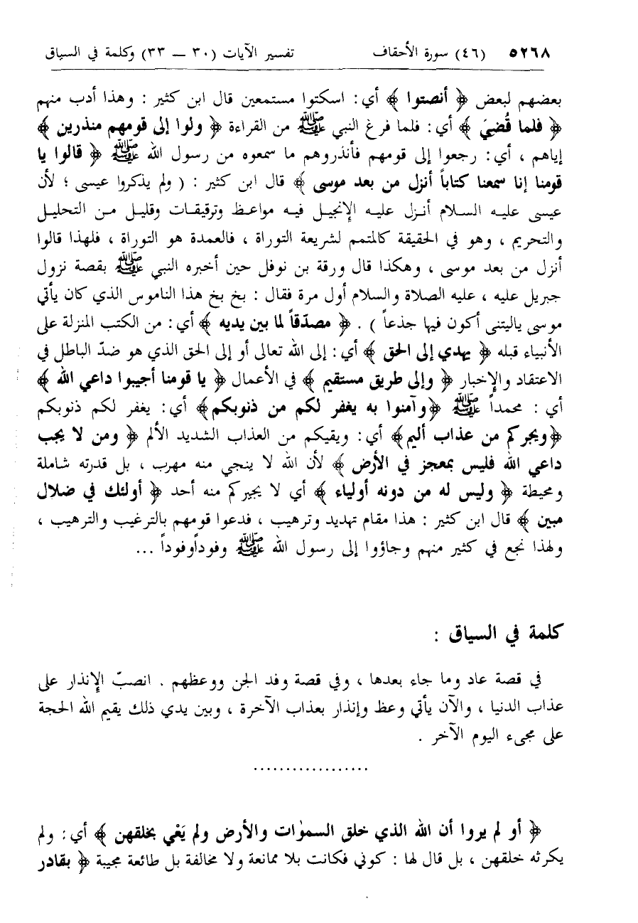 قالُوا يا قَوْمَنا إِنَّا سَمِعْنا كِتاباً أُنْزِلَ مِنْ بَعْدِ مُوسى قال ابن كثير: (ولم يذكروا عيسى؛ لأن عيسى عليه السلام أنزل عليه الإنجيل فيه مواعظ وترقيقات وقليل من التحليل والتحريم، وهو في الحقيقة كالمتمم لشريعة التوراة، فالعمدة هو التوراة، فلهذا قالوا أنزل من بعد موسى، وهكذا قال ورقة بن نوفل حين أخبره النبي صلّى الله عليه وسلم بقصة نزول جبريل عليه، عليه الصلاة والسلام أول مرة فقال: بخ بخ هذا الناموس الذي كان يأتي موسى يا ليتنى أكون فيها جذعا). مُصَدِّقاً لِما بَيْنَ يَدَيْهِ أي: من الكتب المنزلة على الأنبياء قبله يَهْدِي إِلَى الْحَقِّ أي: إلى الله تعالى أو إلى الحق الذي هو ضدّ الباطل في الاعتقاد والإخبار وَإِلى طَرِيقٍ مُسْتَقِيمٍ في الأعمال