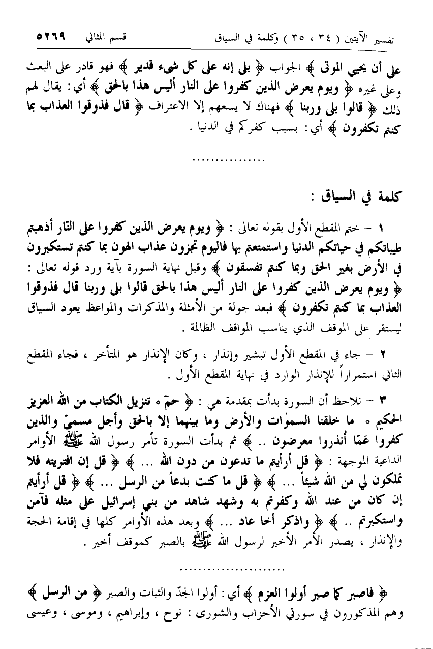 3 - نلاحظ أن السورة بدأت بمقدمة هي: حم* تَنْزِيلُ الْكِتابِ مِنَ اللَّهِ الْعَزِيزِ الْحَكِيمِ* ما خَلَقْنَا السَّماواتِ وَالْأَرْضَ وَما بَيْنَهُما إِلَّا بِالْحَقِّ وَأَجَلٍ مُسَمًّى وَالَّذِينَ كَفَرُوا عَمَّا أُنْذِرُوا مُعْرِضُونَ .. ثم بدأت السورة تأمر رسول الله صلّى الله عليه وسلم الأوامر الداعية الموجهة: قُلْ أَرَأَيْتُمْ ما تَدْعُونَ مِنْ دُونِ اللَّهِ ... قُلْ إِنِ افْتَرَيْتُهُ فَلا تَمْلِكُونَ لِي مِنَ اللَّهِ شَيْئاً ... قُلْ ما كُنْتُ بِدْعاً مِنَ الرُّسُلِ ... قُلْ أَرَأَيْتُمْ إِنْ كانَ مِنْ عِنْدِ اللَّهِ وَكَفَرْتُمْ بِهِ وَشَهِدَ شاهِدٌ مِنْ بَنِي إِسْرائِيلَ عَلى مِثْلِهِ فَآمَنَ وَاسْتَكْبَرْتُمْ .. وَاذْكُرْ أَخا عادٍ ... وبعد هذه الأوامر كلها في إقامة الحجة والإنذار، يصدر الأمر الأخير لرسول الله صلّى الله عليه وسلم بالصبر كموقف أخير.