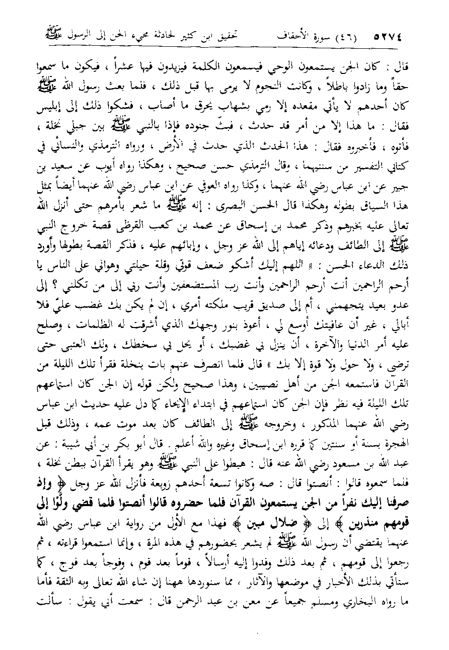 قال: كان الجن يستمعون الوحي فيسمعون الكلمة فيزيدون فيها عشرا، فيكون ما سمعوا حقا وما زادوا باطلا، وكانت النجوم لا يرمى بها قبل ذلك، فلما بعث رسول الله صلّى الله عليه وسلم كان أحدهم لا يأتي مقعده إلا رمي بشهاب يحرق ما أصاب، فشكوا ذلك إلى إبليس فقال: ما هذا إلا من أمر قد حدث، فبثّ جنوده فإذا بالنبي صلّى الله عليه وسلم بين جبلي نخلة، فأتوه، فأخبروه فقال: هذا الحدث الذي حدث في الأرض، ورواه الترمذي والنسائي في كتابي التفسير من سننيهما، وقال الترمذي حسن صحيح، وهكذا رواه أيوب عن سعيد بن جبير عن ابن عباس رضي الله عنهما، وكذا رواه العوفي عن ابن عباس رضي الله عنهما أيضا بمثل هذا السياق بطوله وهكذا قال الحسن البصرى: إنه صلّى الله عليه وسلم ما شعر بأمرهم حتى أنزل الله تعالى عليه بخبرهم وذكر محمد بن إسحاق عن محمد بن كعب القرظى قصة خروج النبي صلّى الله عليه وسلم إلى الطائف ودعائه إياهم إلى الله عزّ وجل، وإبائهم عليه، فذكر القصة بطولها وأورد ذلك الدعاء الحسن: «اللهم إليك أشكو ضعف قوتي وقلة حيلتي وهواني على الناس يا أرحم الراحمين أنت أرحم الراحمين وأنت رب المستضعفين وأنت ربي إلى من تكلني؟ إلى عدو بعيد يتجهمني، أم إلى صديق قريب ملكته أمري، إن لم يكن بك غضب عليّ فلا أبالي، غير أن عافيتك أوسع لي، أعوذ بنور وجهك الذي أشرقت له الظلمات، وصلح عليه أمر الدنيا والآخرة، أن ينزل بي غضبك، أو يحل بي سخطك، ولك العتبى حتى ترضى، ولا حول ولا قوة إلا بك» قال فلما انصرف عنهم بات بنخلة فقرأ تلك الليلة من القرآن فاستمعه الجن من أهل نصيبين، وهذا صحيح ولكن قوله إن الجن كان استماعهم تلك الليلة فيه نظر فإن الجن كان استماعهم في ابتداء الإيحاء كما دل عليه حديث ابن عباس رضي الله عنهما المذكور، وخروجه صلّى الله عليه وسلم إلى الطائف كان بعد موت عمه، وذلك قبل الهجرة بسنة أو سنتين كما قرره ابن إسحاق وغيره والله أعلم. قال أبو بكر بن أبي شيبة: عن عبد الله بن مسعود رضي الله عنه قال: هبطوا على النبي صلّى الله عليه وسلم وهو يقرأ القرآن ببطن نخلة، فلما سمعوه قالوا: أنصتوا قال: صه وكانوا تسعة أحدهم زوبعة فأنزل الله عزّ وجل وَإِذْ صَرَفْنا إِلَيْكَ نَفَراً مِنَ الْجِنِّ يَسْتَمِعُونَ الْقُرْآنَ فَلَمَّا حَضَرُوهُ قالُوا أَنْصِتُوا فَلَمَّا قُضِيَ وَلَّوْا إِلى قَوْمِهِمْ مُنْذِرِينَ إلى ضَلالٍ مُبِينٍ فهذا مع الأول من رواية ابن عباس رضي الله عنهما يقتضي أن رسول الله صلّى الله عليه وسلم لم يشعر بحضورهم في هذه المرة، وإنما استمعوا قراءته، ثم رجعوا إلى قومهم، ثم بعد ذلك وفدوا إليه أرسالا، قوما بعد قوم، وفوجا بعد فوج، كما ستأتي بذلك الأخبار في موضعها والآثار، مما سنوردها هاهنا إن شاء الله تعالى وبه الثقة فأما ما رواه البخاري ومسلم