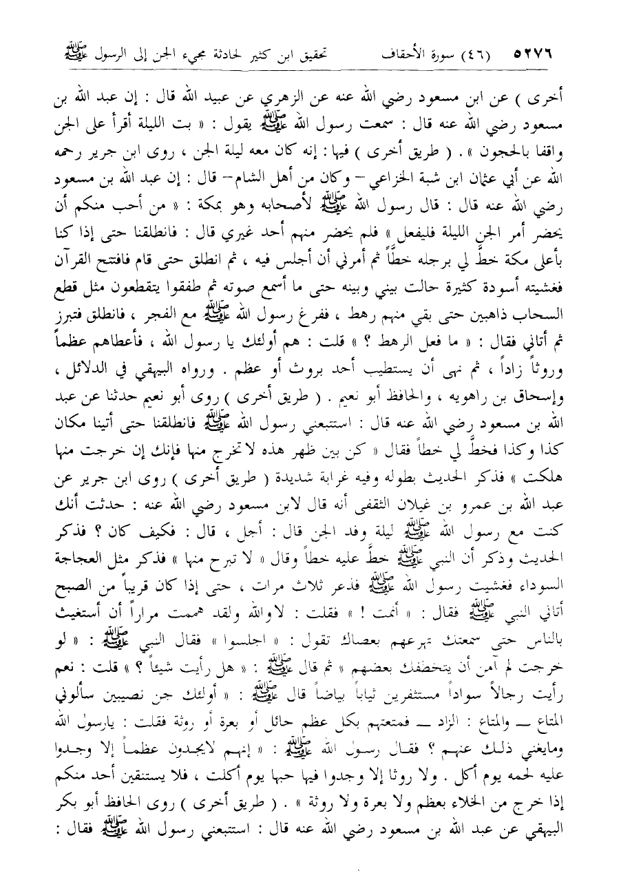 أخرى) عن ابن مسعود رضي الله عنه عن الزهري عن عبيد الله قال: إن عبد الله بن مسعود رضي الله عنه قال: سمعت رسول الله صلّى الله عليه وسلم يقول: «بت الليلة أقرأ على الجن واقفا بالحجون». (طريق أخرى) فيها: إنه كان معه ليلة الجن، روى ابن جرير رحمه الله عن أبي عثمان ابن شبة الخزاعي- وكان من أهل الشام- قال: إن عبد الله بن مسعود رضي الله عنه قال: قال رسول الله صلّى الله عليه وسلم لأصحابه وهو بمكة: «من أحب منكم أن يحضر أمر الجن الليلة فليفعل» فلم يحضر منهم أحد غيري قال: فانطلقنا حتى إذا كنا بأعلى مكة خطّ لي برجله خطّا ثم أمرني أن أجلس فيه، ثم انطلق حتى قام فافتتح القرآن فغشيته أسودة كثيرة حالت بيني وبينه حتى ما أسمع صوته ثم طفقوا يتقطعون مثل قطع السحاب ذاهبين حتى بقي منهم رهط، ففرغ رسول الله صلّى الله عليه وسلم مع الفجر، فانطلق فتبرز ثم أتاني فقال: «ما فعل الرهط؟» قلت: هم أولئك يا رسول الله، فأعطاهم عظما وروثا زادا، ثم نهى أن يستطيب أحد بروث أو عظم. ورواه البيهقي في الدلائل، وإسحاق بن راهويه، والحافظ أبو نعيم. (طريق أخرى) روى أبو نعيم حدثنا عن عبد الله بن مسعود رضي الله عنه قال: استتبعني رسول الله صلّى الله عليه وسلم فانطلقنا حتى أتينا مكان كذا وكذا فخطّ لي خطا فقال «كن بين ظهر هذه لا تخرج منها فإنك إن خرجت منها هلكت» فذكر الحديث بطوله وفيه غرابة شديدة (طريق أخرى) روى ابن جرير عن عبد الله بن عمرو بن غيلان الثقفي أنه قال لابن مسعود رضي الله عنه: حدثت أنك كنت مع رسول الله صلّى الله عليه وسلم ليلة وفد الجن قال: أجل، قال: فكيف كان؟ فذكر الحديث وذكر أن النبي صلّى الله عليه وسلم خطّ عليه خطا وقال «لا تبرح منها» فذكر مثل العجاجة السوداء فغشيت رسول الله صلّى الله عليه وسلم فذعر ثلاث مرات، حتى إذا كان قريبا من الصبح أتاني النبي صلّى الله عليه وسلم فقال: «أنمت!» فقلت: لا والله ولقد هممت مرارا أن أستغيث بالناس حتى سمعتك تهرعهم بعصاك تقول: «اجلسوا» فقال النبي صلّى الله عليه وسلم: «لو خرجت لم آمن أن يتخطفك بعضهم» ثم قال صلّى الله عليه وسلم: «هل رأيت شيئا؟» قلت: نعم رأيت رجالا سوادا مستثفرين ثيابا بياضا قال صلّى الله عليه وسلم: «أولئك جن نصيبين سألوني المتاع- والمتاع: الزاد- فمتعتهم بكل عظم حائل أو بعرة أو روثة فقلت: يا رسول الله وما يغني ذلك عنهم؟ فقال رسول الله صلّى الله عليه وسلم: «إنهم لا يجدون عظما إلا وجدوا عليه لحمه يوم أكل. ولا روثا إلا وجدوا فيها حبها يوم أكلت، فلا يستنقين أحد منكم إذا خرج من الخلاء بعظم ولا بعرة ولا روثة». (طريق أخرى) روى الحافظ أبو بكر البيهقي عن عبد الله بن مسعود رضي الله عنه قال: استتبعني رسول الله صلّى الله عليه وسلم فقال: