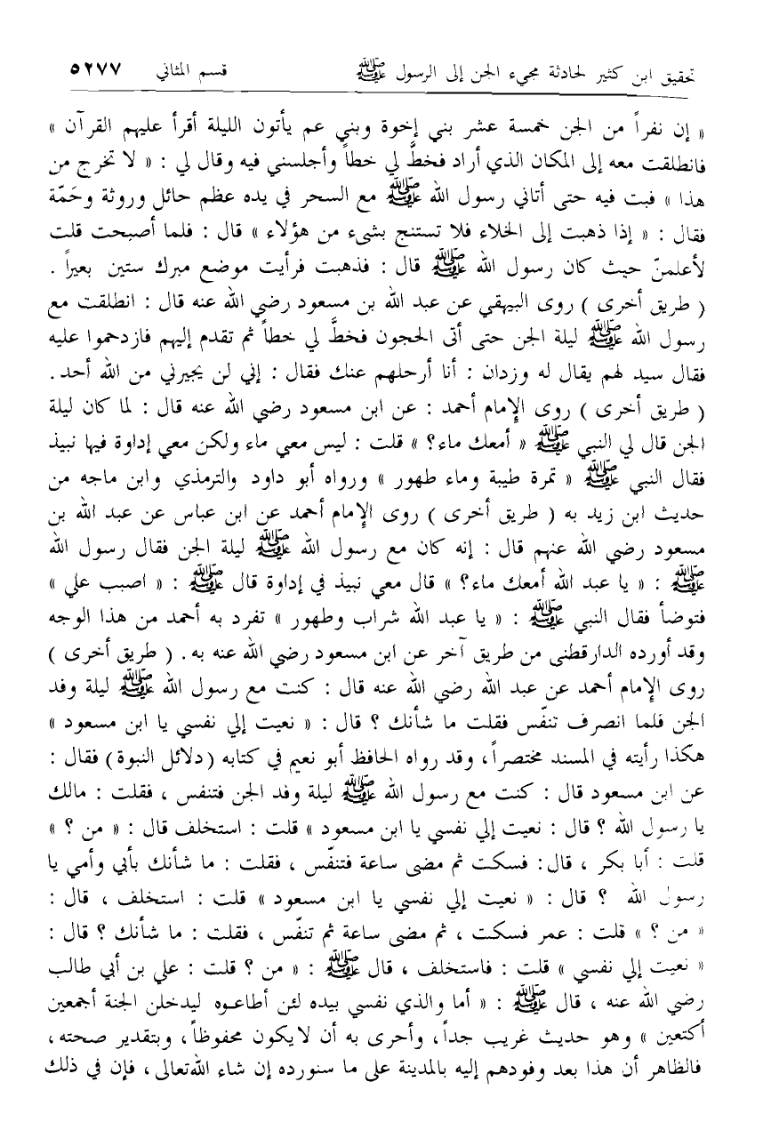 «إن نفرا من الجن خمسة عشر بني إخوة وبني عم يأتون الليلة أقرأ عليهم القرآن» فانطلقت معه إلى المكان الذي أراد فخطّ لي خطا وأجلسني فيه وقال لي: «لا تخرج من هذا» فبت فيه حتى أتاني رسول الله صلّى الله عليه وسلم مع السحر في يده عظم حائل وروثة وحمّة فقال: «إذا ذهبت إلى الخلاء فلا تستنج بشيء من هؤلاء» قال: فلما أصبحت قلت لأعلمنّ حيث كان رسول الله صلّى الله عليه وسلم قال: فذهبت فرأيت موضع مبرك ستين بعيرا.