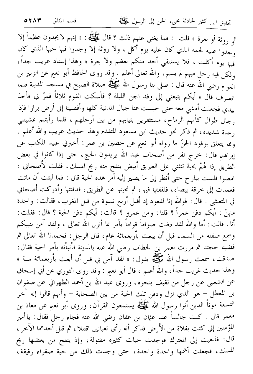 أو روثة أو بعرة» قلت: فما يغني عنهم ذلك؟ قال صلّى الله عليه وسلم: «إنهم لا يجدون عظما إلا وجدوا عليه لحمه الذي كان عليه يوم أكل، ولا روثة إلا وجدوا فيها حبها الذي كان فيها يوم أكلت، فلا يستنقي أحد منكم بعظم ولا بعرة» وهذا إسناد غريب جدا، ولكن فيه رجل مبهم لم يسم، والله تعالى أعلم. وقد روى الحافظ أبو نعيم عن الزبير بن العوام رضي الله عنه قال: صلى بنا رسول الله صلّى الله عليه وسلم صلاة الصبح في مسجد المدينة فلما انصرف قال «أيكم يتبعني إلى وفد الجن الليلة؟ فأسكت القوم ثلاثا فمرّ بي فأخذ بيدي فجعلت أمشي معه حتى حبست عنا جبال المدنية كلها وأفضينا إلى أرض برازا فإذا رجال طوال كأنهم الرماح، مستثفرين بثيابهم من بين أرجلهم، فلما رأيتهم غشيتني رعدة شديدة، ثم ذكر نحو حديث ابن مسعود المتقدم وهذا حديث غريب والله أعلم.