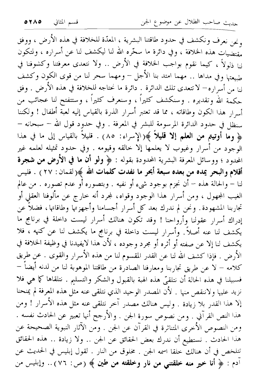 ونحن نعرف ونكشف في حدود طاقتنا البشرية، المعدّة للخلافة في هذه الأرض، ووفق مقتضيات هذه الخلافة، وفي دائرة ما سخّره الله لنا ليكشف لنا عن أسراره، ولتكون لنا ذلولا، كيما نقوم بواجب الخلافة في الأرض .. ولا نتعدى معرفتنا وكشوفنا في طبيعتها وفي مداها .. مهما امتد بنا الأجل- ومهما سحر لنا من قوى الكون وكشف لنا من أسراره- لا تتعدى تلك الدائرة. دائرة ما نحتاجه للخلافة في هذه الأرض. وفق حكمة الله وتقديره. وسنكشف كثيرا، وسنعرف كثيرا، وستتفتح لنا عجائب من أسرار هذا الكون وطاقاته، مما قد تعتبر أسرار الذرة بالقياس إليه لعبة أطفال! ولكننا سنظل في حدود الدائرة المرسومة للبشر في المعرفة. وفي حدود قول الله- سبحانه- وَما أُوتِيتُمْ مِنَ الْعِلْمِ إِلَّا قَلِيلًا (الإسراء: 85). قليلا بالقياس إلى ما في هذا الوجود من أسرار وغيوب لا يعلمها إلا خالقه وقيومه. وفي حدود تمثيله لعلمه غير المحدود؛ ووسائل المعرفة البشرية المحدودة بقوله: وَلَوْ أَنَّما فِي الْأَرْضِ مِنْ شَجَرَةٍ أَقْلامٌ وَالْبَحْرُ يَمُدُّهُ مِنْ بَعْدِهِ سَبْعَةُ أَبْحُرٍ ما نَفِدَتْ كَلِماتُ اللَّهِ (لقمان: 27). فليس لنا- والحالة هذه- أن نجزم بوجود شئ أو نفيه. وبتصوره أو عدم تصوره. من عالم الغيب المجهول، ومن أسرار هذا الوجود وقواه، لمجرد أنه خارج عن مألوفنا العقلي أو تجاربنا المشهودة. ونحن لم ندرك بعد كل أسرار أجسامنا وأجهزتها وطاقاتها، فضلا عن إدراك أسرار عقولنا وأرواحنا! وقد تكون هنالك أسرار ليست داخلة في برنامج ما يكشف لنا عنه أصلا. وأسرار ليست داخلة في برنامج ما يكشف لنا عن كنهه، فلا يكشف لنا إلا عن صفته أو أثره أو مجرد وجوده، لأن هذا لا يفيدنا في وظيفة الخلافة في الأرض. فإذا كشف الله لنا عن القدر المقسوم لنا من هذه الأسرار والقوى. عن طريق كلامه- لا عن طريق تجاربنا ومعارفنا الصادرة من طاقتنا الموهوبة لنا من لدنه أيضا- فسبيلنا في هذه الحالة أن نتلقّى هذه الهبة بالقبول والشكر والتسليم. نتلقاها كما هي فلا نزيد عليها ولا ننقص منها. لأن المصدر الوحيد الذي نتلقى عنه مثل هذه المعرفة لم يمنحنا إلا هذا القدر بلا زيادة. وليس هنالك مصدر آخر نتلقى عنه مثل هذه الأسرار! ومن هذا النص القرآني. ومن نصوص سورة الجن. والأرجح أنها تعبير عن الحادث نفسه.