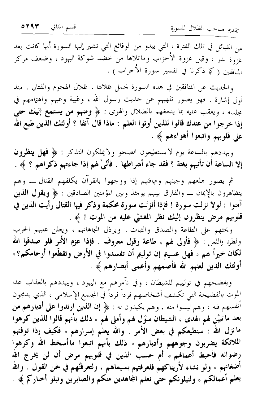 والحديث عن المنافقين في هذه السورة يحمل ظلالها. ظلال الهجوم والقتال. منذ أول إشارة. فهو يصور تلهيهم عن حديث رسول الله، وغيبة وعيهم واهتمامهم في مجلسه، ويعقب عليه بما يدمغهم بالضلال والهوى: وَمِنْهُمْ مَنْ يَسْتَمِعُ إِلَيْكَ حَتَّى إِذا خَرَجُوا مِنْ عِنْدِكَ قالُوا لِلَّذِينَ أُوتُوا الْعِلْمَ: ماذا قالَ آنِفاً؟ أُولئِكَ الَّذِينَ طَبَعَ اللَّهُ عَلى قُلُوبِهِمْ وَاتَّبَعُوا أَهْواءَهُمْ.