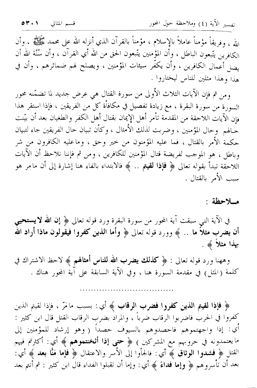 ومن ثم فإن الآيات الثلاث الأولى من سورة القتال هي عرض جديد لما تضمّنه محور السورة من سورة البقرة، مع زيادة تفصيل في مكافأة كل من الفريقين، فإذا استقر هذا فإن الآيات اللاحقة من المقدمة تأمر أهل الإيمان بقتال أهل الكفر والطغيان بعد أن بيّنت حالهم وحال المؤمنين، وضربت لذلك الأمثال، وكأن تبيان حال الفريقين جاء لتبيان حكمة الأمر بالقتال، فما عليه المؤمنون من خير وحق، وما عليه الكافرون من شر وباطل، هو الموجب لفريضة قتال المؤمنين للكافرين، ومن ثم فإننا نلاحظ أن الآيات اللاحقة تبدأ بقوله تعالى فَإِذا لَقِيتُمُ .. فالابتداء بالفاء هنا إشارة إلى أن ما مر هو سبب الأمر بالقتال.
