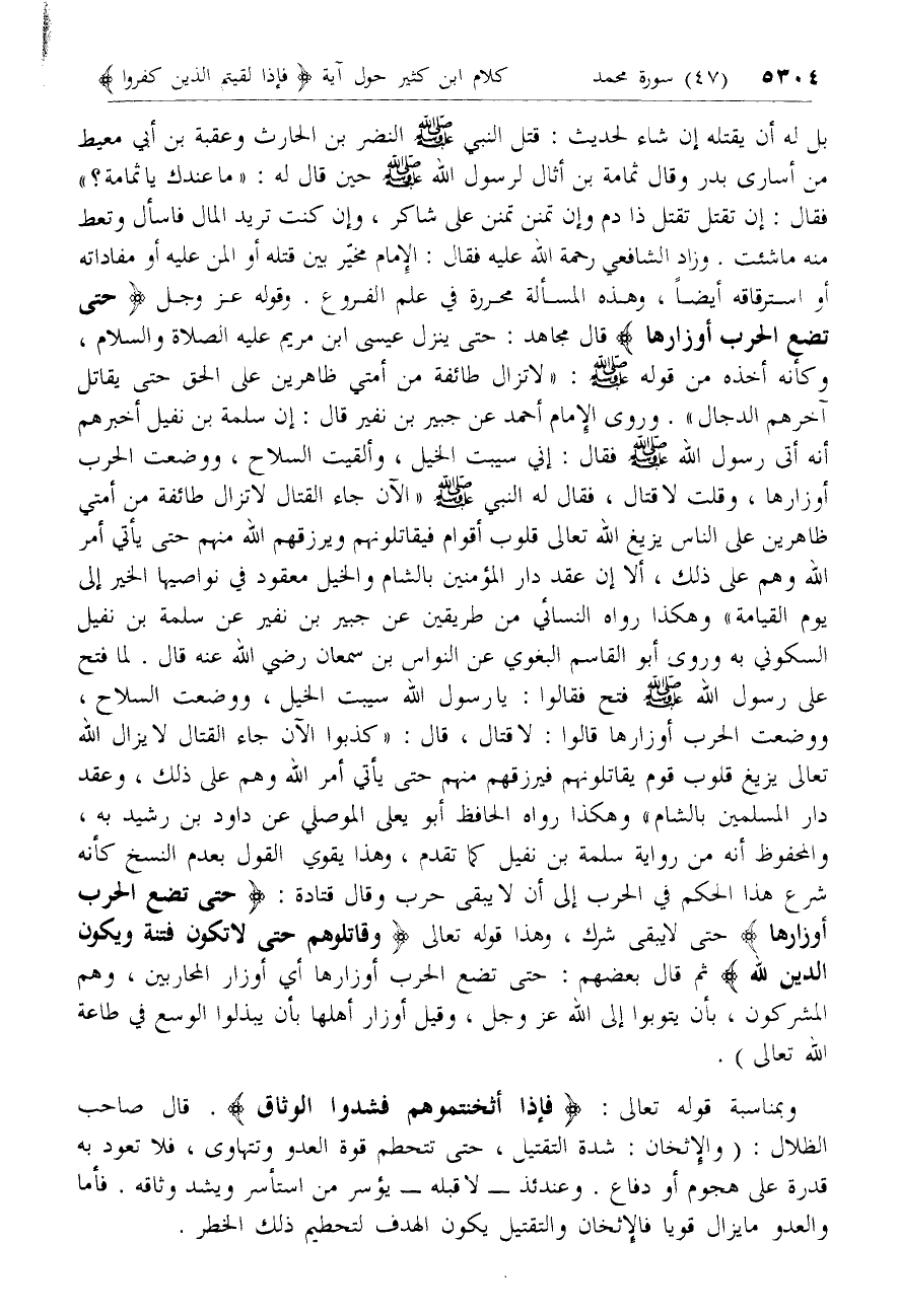 بل له أن يقتله إن شاء لحديث: قتل النبي صلّى الله عليه وسلم النضر بن الحارث وعقبة بن أبي معيط من أسارى بدر وقال ثمامة بن أثال لرسول الله صلّى الله عليه وسلم حين قال له: «ما عندك يا ثمامة؟» فقال: إن تقتل تقتل ذا دم وإن تمنن تمنن على شاكر، وإن كنت تريد المال فاسأل وتعط منه ما شئت. وزاد الشافعي رحمة الله عليه فقال: الإمام مخيّر بين قتله أو المن عليه أو مفاداته أو استرقاقه أيضا، وهذه المسألة محررة في علم الفروع. وقوله عزّ وجل حَتَّى تَضَعَ الْحَرْبُ أَوْزارَها قال مجاهد: حتى ينزل عيسى ابن مريم عليه الصلاة والسلام، وكأنه أخذه من قوله صلّى الله عليه وسلم: «لا تزال طائفة من أمتي ظاهرين على الحق حتى يقاتل آخرهم الدجال». وروى الإمام أحمد عن جبير بن نفير قال: إن سلمة بن نفيل أخبرهم أنه أتى رسول الله صلّى الله عليه وسلم فقال: إني سيبت الخيل، وألقيت السلاح، ووضعت الحرب أوزارها، وقلت لا قتال، فقال له النبي صلّى الله عليه وسلم «الآن جاء القتال لا تزال طائفة من أمتي ظاهرين على الناس يزيغ الله تعالى قلوب أقوام فيقاتلونهم ويرزقهم الله منهم حتى يأتي أمر الله وهم على ذلك، ألا إن عقد دار المؤمنين بالشام والخيل معقود في نواصيها الخير إلى يوم القيامة» وهكذا رواه النسائي من طريقين عن جبير بن نفير عن سلمة بن نفيل السكوني به وروى أبو القاسم البغوي عن النواس بن سمعان رضي الله عنه قال: لما فتح على رسول الله صلّى الله عليه وسلم فتح فقالوا: يا رسول الله سيبت الخيل، ووضعت السلاح، ووضعت الحرب أوزارها قالوا: لا قتال، قال: «كذبوا الآن جاء القتال لا يزال الله تعالى يزيغ قلوب قوم يقاتلونهم فيرزقهم منهم حتى يأتي أمر الله وهم على ذلك، وعقد دار المسلمين بالشام» وهكذا رواه الحافظ أبو يعلى الموصلي عن داود بن رشيد به، والمحفوظ أنه من رواية سلمة بن نفيل كما تقدم، وهذا يقوي القول بعدم النسخ كأنه شرع هذا الحكم في الحرب إلى أن لا يبقى حرب وقال قتادة: حَتَّى تَضَعَ الْحَرْبُ أَوْزارَها حتى لا يبقى شرك، وهذا قوله تعالى وَقاتِلُوهُمْ حَتَّى لا تَكُونَ فِتْنَةٌ وَيَكُونَ الدِّينُ لِلَّهِ ثم قال بعضهم: حتى تضع الحرب أوزارها أي أوزار المحاربين، وهم المشركون، بأن يتوبوا إلى الله عزّ وجل، وقيل أوزار أهلها بأن يبذلوا الوسع في طاعة الله تعالى).