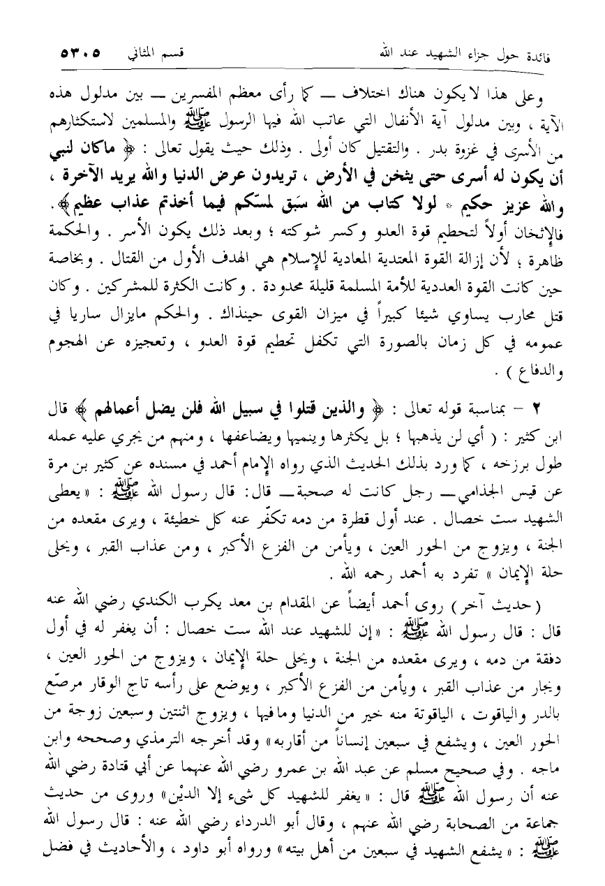 2 - بمناسبة قوله تعالى: وَالَّذِينَ قُتِلُوا فِي سَبِيلِ اللَّهِ فَلَنْ يُضِلَّ أَعْمالَهُمْ قال ابن كثير: (أي لن يذهبها؛ بل يكثرها وينميها ويضاعفها، ومنهم من يجري عليه عمله طول برزخه، كما ورد بذلك الحديث الذي رواه الإمام أحمد في مسنده عن كثير بن مرة عن قيس الجذامي- رجل كانت له صحبة- قال: قال رسول الله صلّى الله عليه وسلم: «يعطى الشهيد ست خصال. عند أول قطرة من دمه تكفّر عنه كل خطيئة، ويرى مقعده من الجنة، ويزوج من الحور العين، ويأمن من الفزع الأكبر، ومن عذاب القبر، ويحلى حلة الإيمان» تفرد به أحمد رحمه الله.