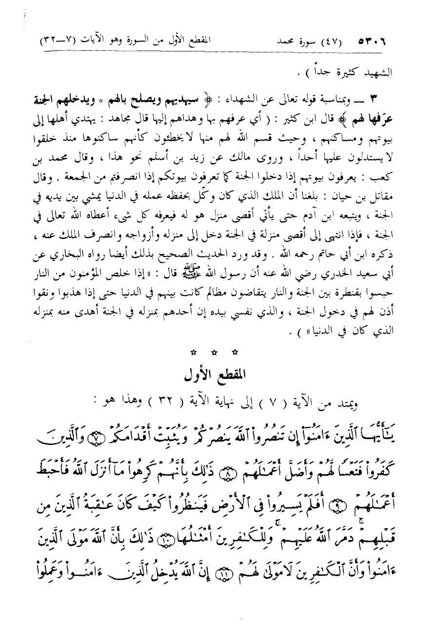 3 - وبمناسبة قوله تعالى عن الشهداء: سَيَهْدِيهِمْ وَيُصْلِحُ بالَهُمْ* وَيُدْخِلُهُمُ الْجَنَّةَ عَرَّفَها لَهُمْ قال ابن كثير: (أي عرفهم بها وهداهم إليها قال مجاهد: يهتدي أهلها إلى بيوتهم ومساكنهم، وحيث قسم الله لهم منها لا يخطئون كأنهم ساكنوها منذ خلقوا لا يستدلون عليها أحدا، وروى مالك عن زيد بن أسلم نحو هذا، وقال محمد بن كعب: يعرفون بيوتهم إذا دخلوا الجنة كما تعرفون بيوتكم إذا انصرفتم من الجمعة. وقال مقاتل بن حيان: بلغنا أن الملك الذي كان وكلّ بحفظه عمله في الدنيا يمشي بين يديه في الجنة، ويتبعه ابن آدم حتى يأتي أقصى منزل هو له فيعرفه كل شئ أعطاه الله تعالى في الجنة، فإذا انتهى إلى أقصى منزلة في الجنة دخل إلى منزله وأزواجه وانصرف الملك عنه، ذكره ابن أبي حاتم رحمه الله. وقد ورد الحديث الصحيح بذلك أيضا رواه البخاري عن أبي سعيد الخدري رضي الله عنه أن رسول الله صلّى الله عليه