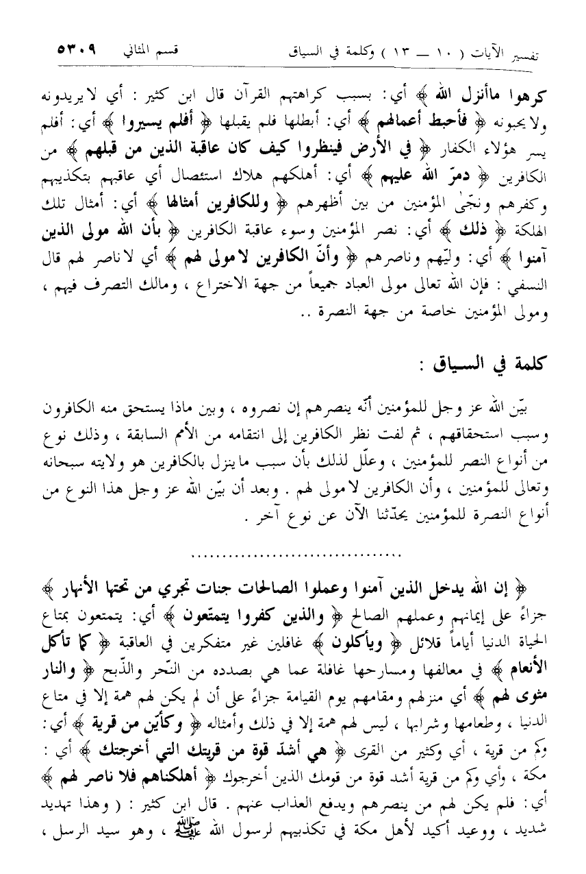 بيّن الله عزّ وجل للمؤمنين أنّه ينصرهم إن نصروه، وبين ماذا يستحق منه الكافرون وسبب استحقاقهم، ثم لفت نظر الكافرين إلى انتقامه من الأمم السابقة، وذلك نوع من أنواع النصر للمؤمنين، وعلّل لذلك بأن سبب ما ينزل بالكافرين هو ولايته سبحانه وتعالى للمؤمنين، وأن الكافرين لا مولى لهم. وبعد أن بيّن الله عزّ وجل هذا النوع من أنواع النصرة للمؤمنين يحدّثنا الآن عن نوع آخر.