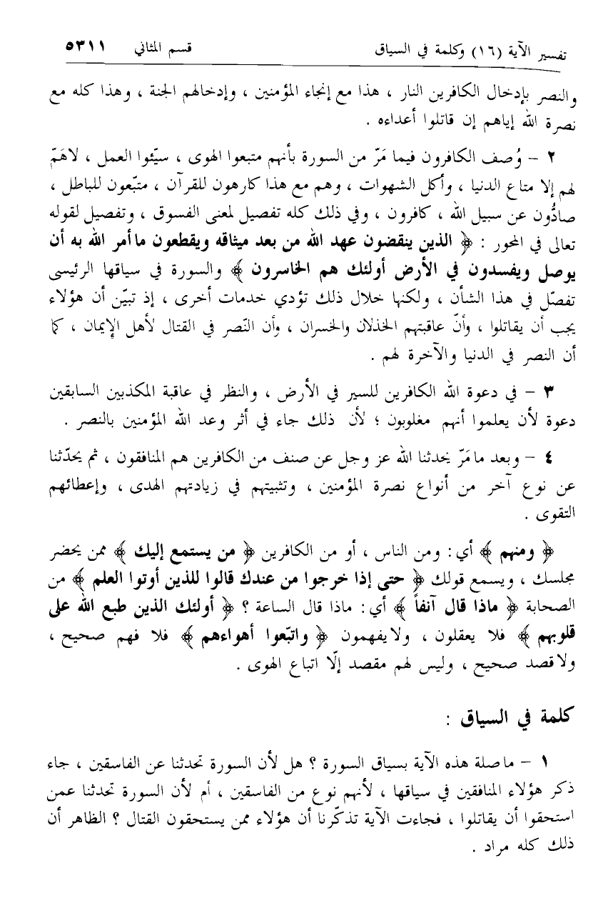 2 - وصف الكافرون فيما مرّ من السورة بأنهم متبعو الهوى، سيّئوا العمل، لا همّ لهم إلا متاع الدنيا، وأكل الشهوات، وهم مع هذا كارهون للقرآن، متّبعون للباطل، صادّون عن سبيل الله، كافرون، وفي ذلك كله تفصيل لمعنى الفسوق، وتفصيل لقوله تعالى في المحور: الَّذِينَ يَنْقُضُونَ عَهْدَ اللَّهِ مِنْ بَعْدِ مِيثاقِهِ وَيَقْطَعُونَ ما أَمَرَ اللَّهُ بِهِ أَنْ يُوصَلَ وَيُفْسِدُونَ فِي الْأَرْضِ أُولئِكَ هُمُ الْخاسِرُونَ والسورة في سياقها الرئيسى تفصّل في هذا الشأن، ولكنها خلال ذلك تؤدي خدمات أخرى، إذ تبيّن أن هؤلاء يجب أن يقاتلوا، وأنّ عاقبتهم الخذلان والخسران، وأن النّصر في القتال لأهل الإيمان، كما أن النصر في الدنيا والآخرة لهم.