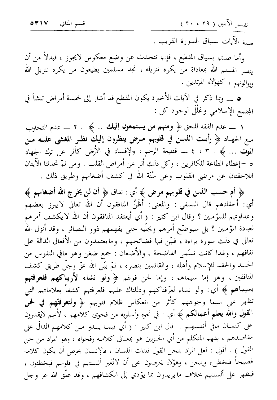 وبما ذكر في الآيات الأخيرة يكون المقطع قد أشار إلى خمسة أمراض تنشأ في المجتمع الإسلامي وعلّل لوجود كل: