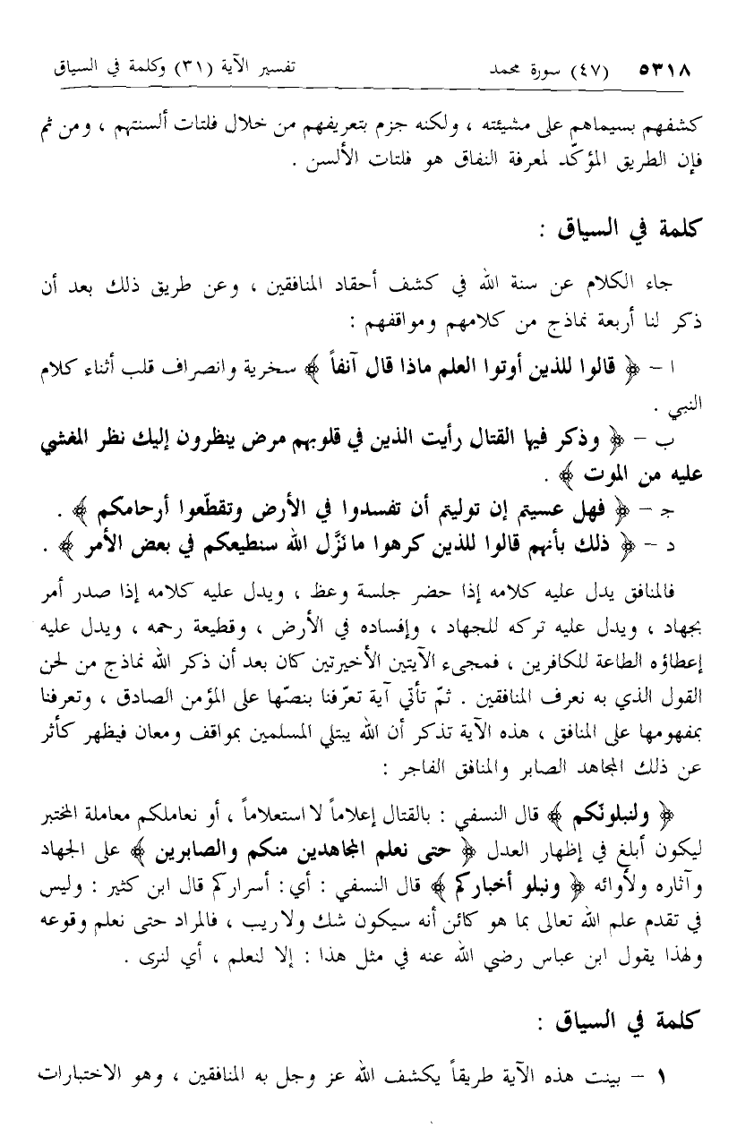 وَلَنَبْلُوَنَّكُمْ قال النسفي: بالقتال إعلاما لا استعلاما، أو نعاملكم معاملة المختبر ليكون أبلغ في إظهار العدل حَتَّى نَعْلَمَ الْمُجاهِدِينَ مِنْكُمْ وَالصَّابِرِينَ على الجهاد وآثاره ولأوائه وَنَبْلُوَا أَخْبارَكُمْ قال النسفي: أي: أسراركم قال ابن كثير: وليس في تقدم علم الله تعالى بما هو كائن أنه سيكون شك ولا ريب، فالمراد حتى نعلم وقوعه ولهذا يقول ابن عباس رضي الله عنه في مثل هذا: إلا لنعلم، أي لنرى.