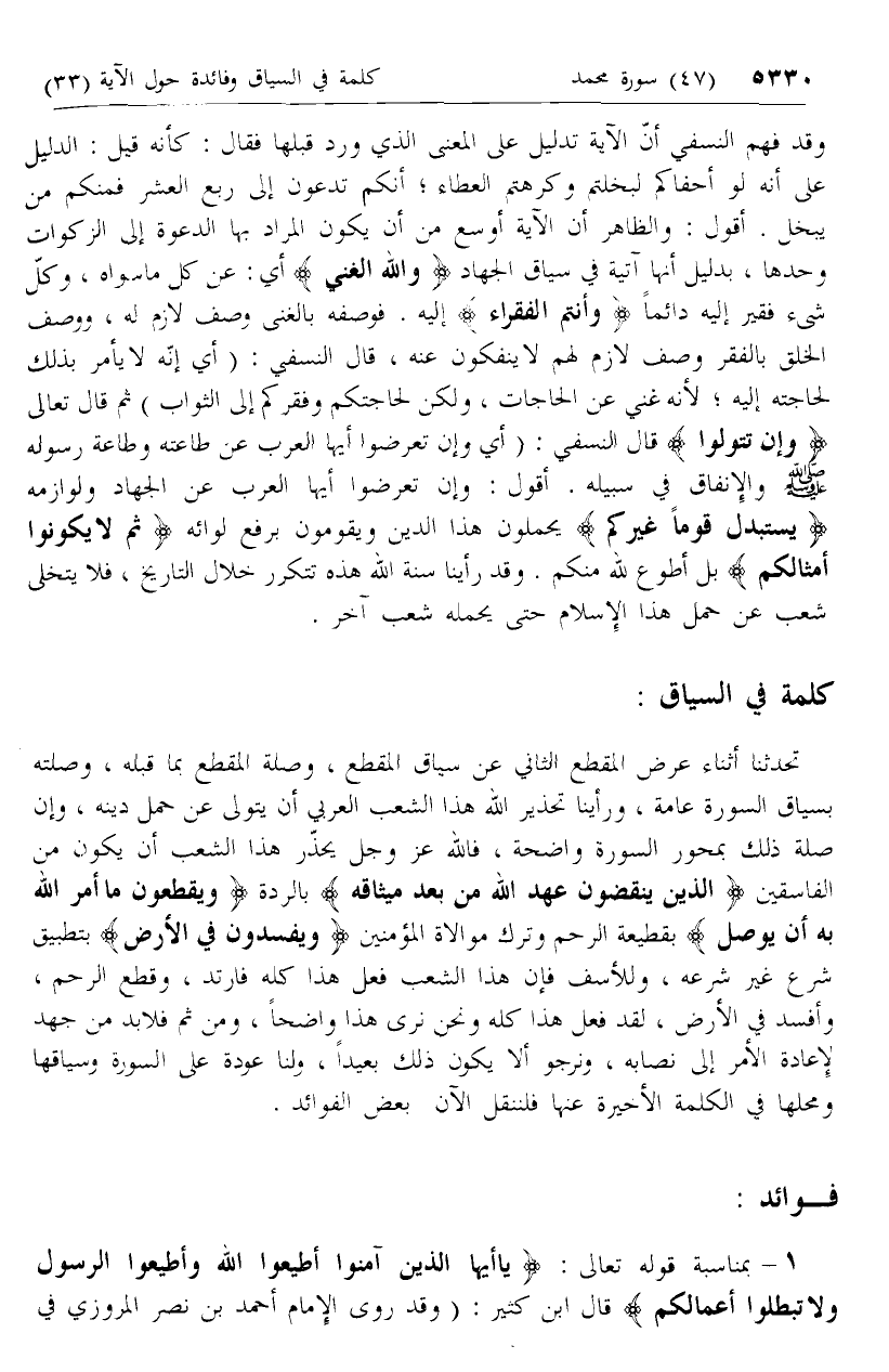 وقد فهم النسفي أنّ الآية تدليل على المعنى الذي ورد قبلها فقال: كأنه قيل: الدليل على أنه لو أحفاكم لبخلتم وكرهتم العطاء؛ أنكم تدعون إلى ربع العشر فمنكم من يبخل. أقول: والظاهر أن الآية أوسع من أن يكون المراد بها الدعوة إلى الزكوات وحدها، بدليل أنها آتية في سياق الجهاد وَاللَّهُ الْغَنِيُّ أي: عن كل ما سواه، وكلّ شئ فقير إليه دائما وَأَنْتُمُ الْفُقَراءُ إليه. فوصفه بالغنى وصف لازم له، ووصف الخلق بالفقر وصف لازم لهم لا ينفكون عنه، قال النسفي: (أي إنّه لا يأمر بذلك لحاجته إليه؛ لأنه غني عن الحاجات، ولكن لحاجتكم وفقركم إلى الثواب) ثم قال تعالى وَإِنْ تَتَوَلَّوْا قال النسفي: (أي وإن تعرضوا أيها العرب عن طاعته وطاعة رسوله صلّى الله عليه وسلم والإنفاق في سبيله. أقول: وإن تعرضوا أيها العرب عن الجهاد ولوازمه يَسْتَبْدِلْ قَوْماً غَيْرَكُمْ يحملون هذا الدين ويقومون برفع لوائه ثُمَّ لا يَكُونُوا أَمْثالَكُمْ بل أطوع لله منكم. وقد رأينا سنة الله هذه تتكرر خلال التاريخ، فلا يتخلى شعب عن حمل هذا الإسلام حتى يحمله شعب آخر.