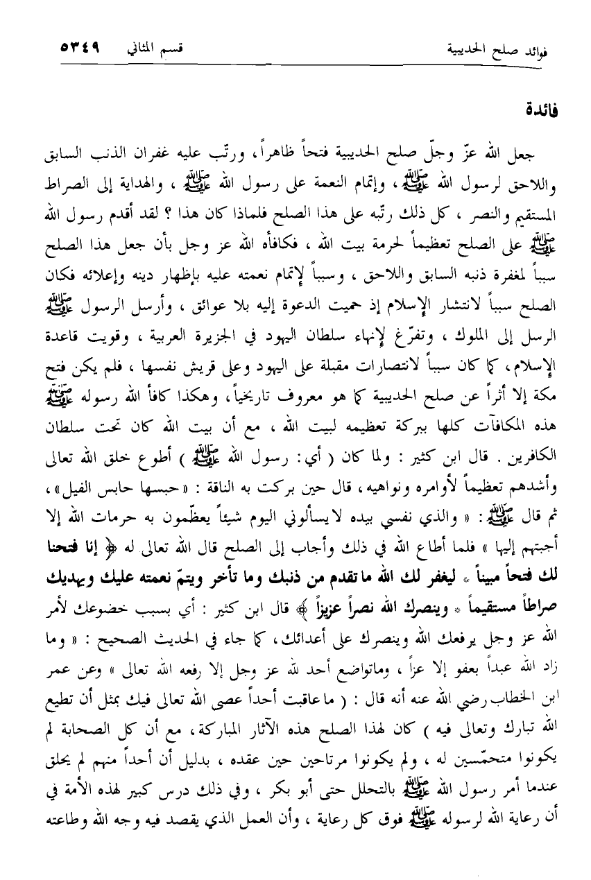 وروى الإمام أحمد- بإسناده- عن مجمع بن حارثة الأنصاري- رضي الله عنه- وكان أحد القراء الذين قرءوا القرآن. قال: شهدنا الحديبية، فلما انصرفنا عنها إذا الناس ينفرون الأباعر، فقال الناس بعضهم لبعض: ما للناس؟ قالوا: أوحي إلى رسول الله- صلّى الله عليه وآله وسلم- فخرجنا مع الناس نوجف فإذا رسول الله- صلّى الله عليه وسلم- على راحلته عند كراع الغميم، فاجتمع الناس عليه فقرأ عليهم: «إنا فتحنا لك فتحا مبينا» .. قال: فقال رجل من أصحاب رسول الله- صلّى الله عليه وسلم-: أي رسول الله أو فتح هو؟ قال- صلّى الله عليه وسلم-: «7 ي والذي نفس محمد بيده إنه لفتح» .. وروى الإمام أحمد- بإسناده- عن عمر بن الخطاب- رضي الله عنه- قال: كنا مع رسول الله- صلّى الله عليه وسلم- في سفر. قال: فسألته عن شئ ثلاث مرات فلم يرد عليّ. قال:
