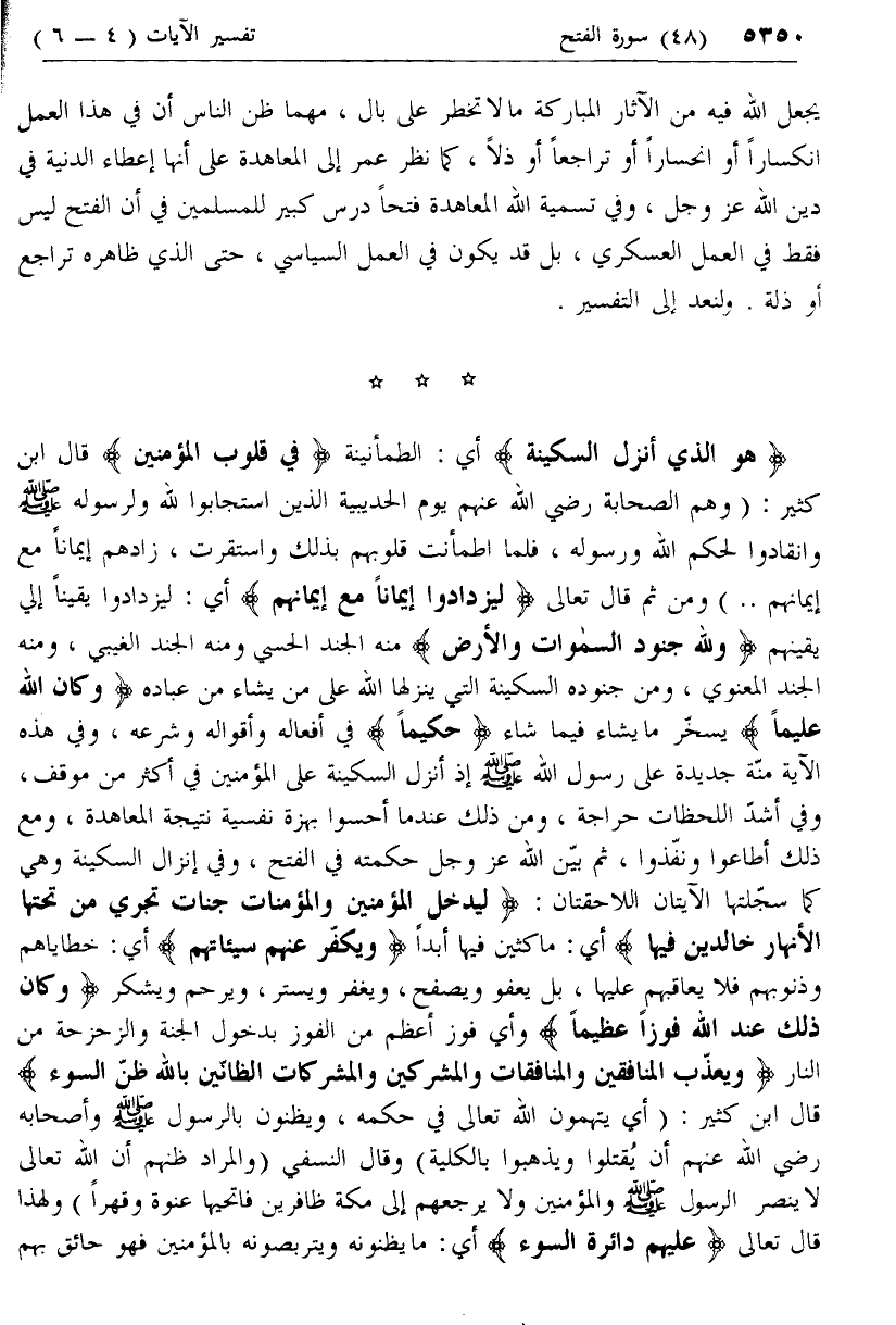 إِنَّا فَتَحْنا لَكَ فَتْحاً مُبِيناً أي: بيّنا ظاهرا. قال ابن كثير: والمراد به صلح الحديبية فإنه حصل بسببه خير جزيل، وأمن الناس، واجتمع بعضهم ببعض، وتكلم المؤمن مع الكافر، وانتشر العلم النافع والإيمان