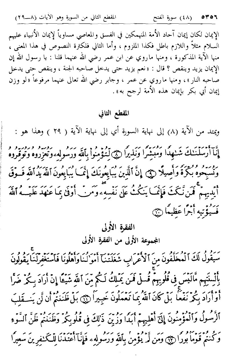 بمناسبة قوله تعالى لِيَغْفِرَ لَكَ اللَّهُ ما تَقَدَّمَ مِنْ ذَنْبِكَ وَما تَأَخَّرَ قال ابن كثير: (وروى الإمام أحمد عن مجمع بن حارثة الأنصاري رضي الله عنه- وكان أحد القراء الذين قرءوا القرآن- قال: شهدنا الحديبية، فلما انصرفنا عنها إذا الناس ينفرون الأباعر، فقال الناس بعضهم لبعض: ما للناس؟ قالوا أوحي إلى رسول الله صلّى الله عليه وسلم، فخرجنا مع الناس نوجف، فإذا رسول الله صلّى الله عليه وسلم على راحلته عند كراع الغميم، فاجتمع الناس عليه فقرأ عليهم إِنَّا فَتَحْنا لَكَ فَتْحاً مُبِيناً قال: فقال رجل من أصحاب رسول الله صلّى الله عليه وسلم: أي رسول الله أو فتح هو؟ قال صلّى الله عليه وسلم «إي والذي نفس محمد بيده إنه لفتح» قسمت خيبر على أهل الحديبية لم يدخل معهم فيها أحد إلا من شهد الحديبية، فقسمها رسول الله صلّى الله عليه وسلم ثمانية عشر سهما، وكان الجيش ألفا وخمسمائة منهم ثلاثمائة فارس، فأعطى الفارس سهمين، وأعطى الراجل سهما، ورواه أبو داود في الجهاد وروى ابن جرير عن عبد الرحمن بن أبي علقمة قال: سمعت عبد الله بن مسعود رضي الله عنه يقول: لما أقبلنا من الحديبية عرسنا فنمنا، فلم نستيقظ إلا والشمس قد طلعت، فاستيقظنا ورسول الله صلّى الله عليه وسلم نائم قال: فقلنا: أيقظوه فاستيقظ رسول الله صلّى الله عليه وسلم فقال: «افعلوا ما كنتم تفعلون، وكذلك يفعل من نام أو نسي» قال: وفقدنا ناقة رسول الله صلّى الله عليه وسلم، فطلبناها فوجدناها قد تعلق خطامها بشجرة، فأتيته بها فركبها، فبينا نحن نسير إذ أتاه الوحي، قال: وكان إذا أتاه الوحي اشتد عليه، فلما سري عنه أخبرنا أنه أنزل عليه إِنَّا فَتَحْنا لَكَ فَتْحاً مُبِيناً وقد رواه أحمد وأبو داود والنسائي من غير وجه عن جامع بن شداد به وروى الإمام أحمد عن المغيرة بن شعبة قال: كان النبي صلّى الله عليه وسلم يصلي حتى ترم قدماه، فقيل له أليس قد غفر الله لك ما تقدم من ذنبك وما تأخر؟ فقال صلّى الله عليه وسلم: «أفلا أكون عبدا شكورا؟» أخرجاه وبقية الجماعة إلا أبا داود من حديث زياد به. وروى الإمام أحمد عن عائشة رضي الله عنها قالت: كان رسول الله صلّى الله عليه وسلم إذا صلى قام حتى تتفطر رجلاه، فقالت له عائشة رضي الله عنها: يا رسول الله أتصنع هذا وقد غفر لك الله ما تقدّم من ذنبك وما تأخّر؟ فقال صلّى الله عليه وسلم: «يا عائشة أفلا أكون عبدا شكورا» أخرجه مسلم في الصحيح من رواية عبد الله بن وهب به. وروى ابن أبي حاتم عن قتادة عن أنس قال: قام رسول الله صلّى الله عليه وسلم حتى تورّمت قدماه- أو قال