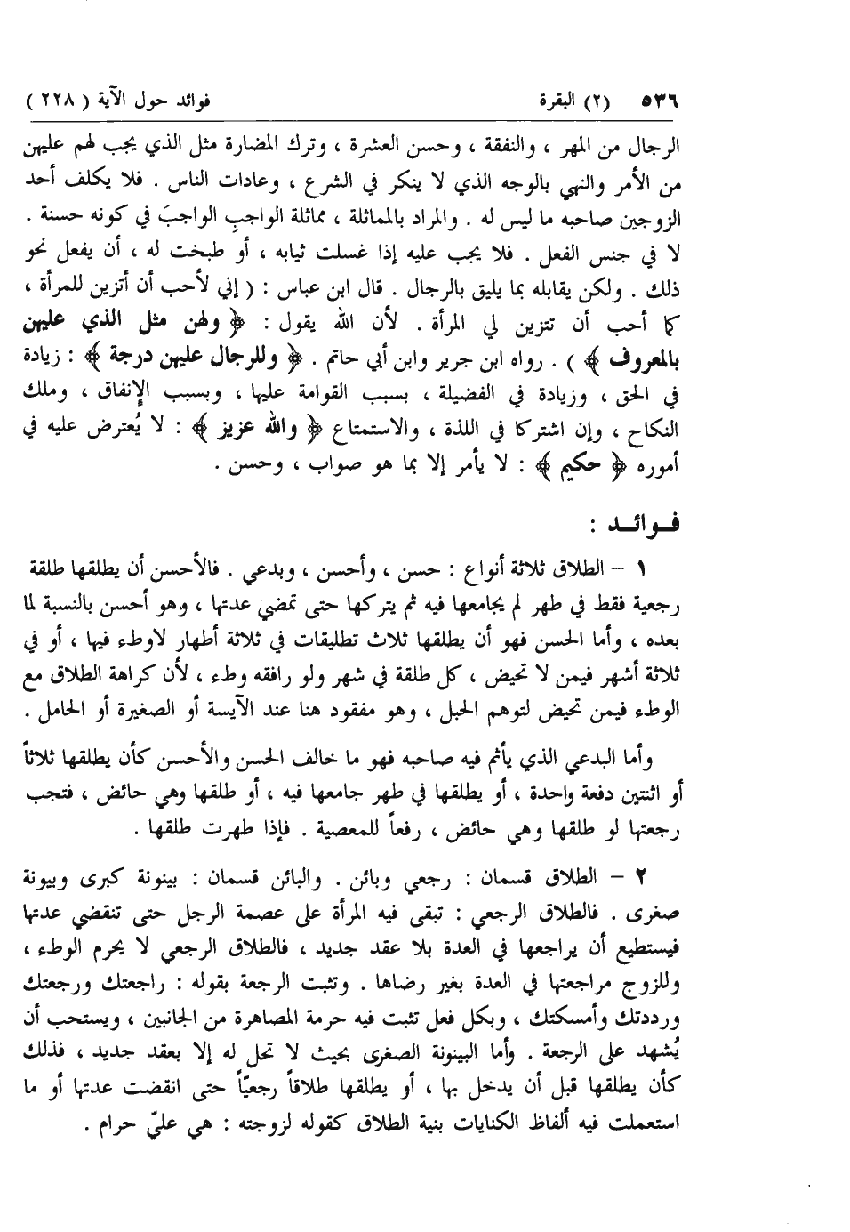 لا في جنس الفعل. فلا يجب عليه إذا غسلت ثيابه، أو طبخت له، أن يفعل نحو ذلك. ولكن يقابله بما يليق بالرجال. قال ابن عباس: (إني لأحب أن أتزين للمرأة، كما أحب أن تتزين لي المرأة. لأن الله يقول: وَلَهُنَّ مِثْلُ الَّذِي عَلَيْهِنَّ بِالْمَعْرُوفِ). رواه ابن جرير وابن أبي حاتم. وَلِلرِّجالِ عَلَيْهِنَّ دَرَجَةٌ: زيادة في الحق، وزيادة في الفضيلة، بسبب القوامة عليها، وبسبب الإنفاق، وملك النكاح، وإن اشتركا في اللذة، والاستمتاع وَاللَّهُ عَزِيزٌ: لا يعترض عليه في أموره حَكِيمٌ: لا يأمر إلا بما هو صواب، وحسن.