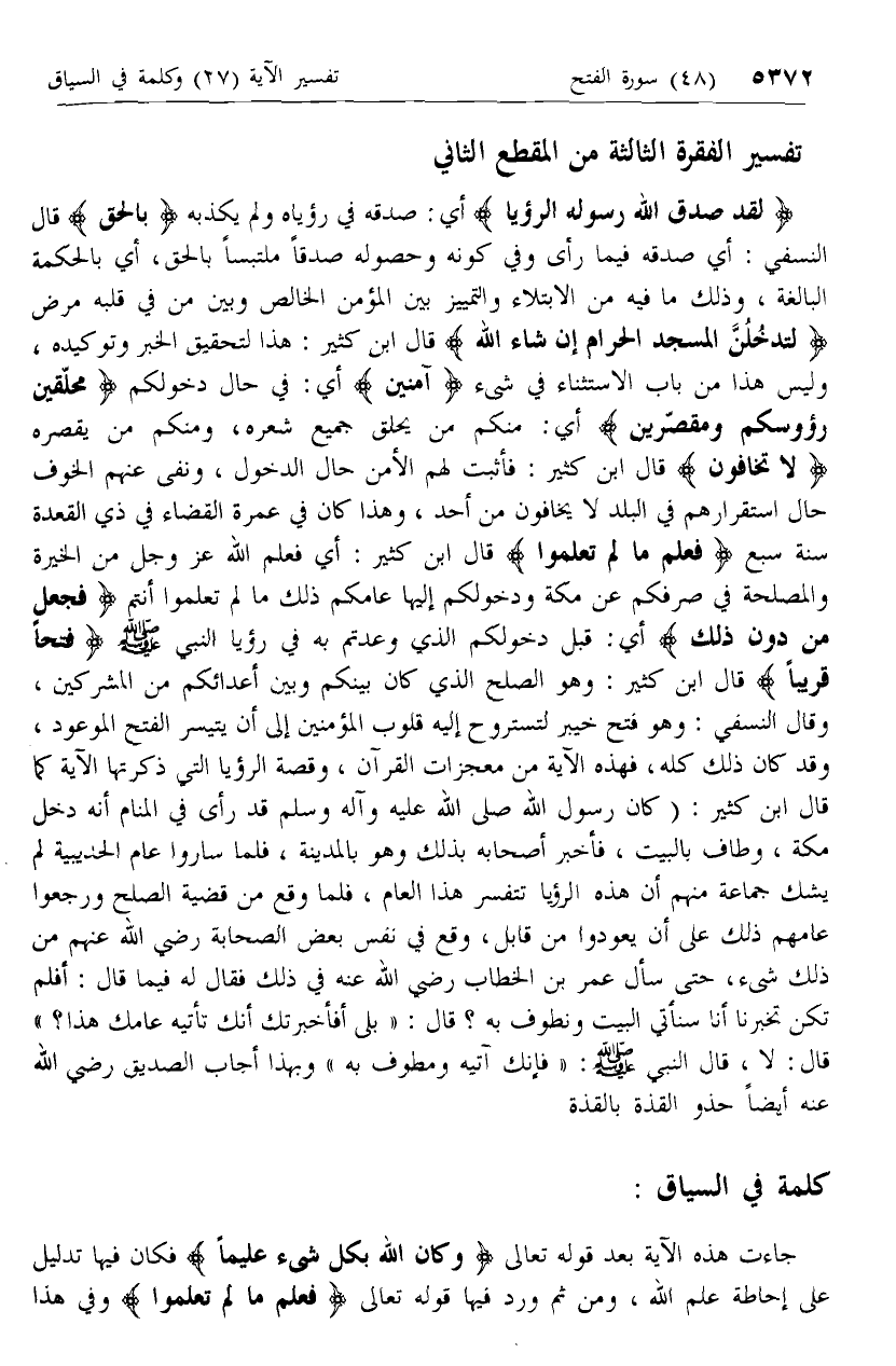 إِذْ جَعَلَ الَّذِينَ كَفَرُوا فِي قُلُوبِهِمُ الْحَمِيَّةَ أي: الأنفة حَمِيَّةَ الْجاهِلِيَّةِ أي: أنفتها التي هي أثر الجهل، وكانت حميتهم أنهم لم يقروا أنه رسول الله صلّى الله عليه وسلم، ولم يقروا ببسم الله الرحمن الرحيم. وحالوا بينهم وبين البيت فَأَنْزَلَ اللَّهُ سَكِينَتَهُ عَلى رَسُولِهِ وَعَلَى الْمُؤْمِنِينَ المراد بالسكينة هنا الطمأنينة والوقار والحلم، وهو ما قابلوا به حمية المشركين في المواقف التي رأيناها وَأَلْزَمَهُمْ كَلِمَةَ التَّقْوى أي: كلمة التوحيد التي هي عماد التقوى، والتي تجعل صاحبها لا يتحرك إلا أثرا عنها وَكانُوا أي: المؤمنون أَحَقَّ بِها من غيرهم وَأَهْلَها بتأهيل الله إياهم وَكانَ اللَّهُ بِكُلِّ شَيْءٍ عَلِيماً فيجري الأمور على مصالحها، أي هو عليم بمن