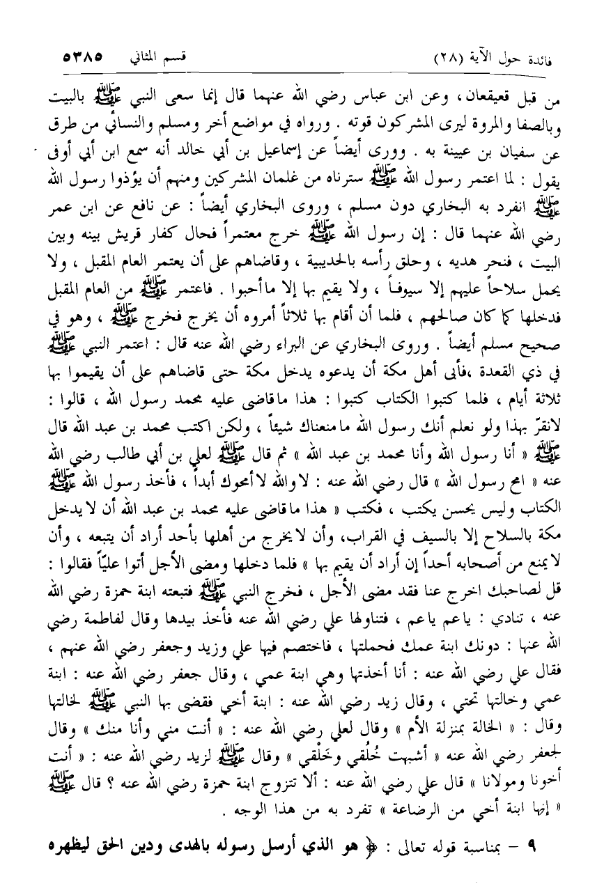 من قبل قعيقعان، وعن ابن عباس رضي الله عنهما قال إنما سعى النبي صلّى الله عليه وسلم بالبيت وبالصفا والمروة ليرى المشركون قوته. ورواه في مواضع أخر ومسلم والنسائي من طرق عن سفيان بن عيينة به. وروى أيضا عن إسماعيل بن أبي خالد أنه سمع ابن أبي أوفى يقول: لما اعتمر رسول الله صلّى الله عليه وسلم سترناه من غلمان المشركين ومنهم أن يؤذوا رسول الله صلّى الله عليه وسلم انفرد به البخاري دون مسلم، وروى البخاري أيضا: عن نافع عن ابن عمر رضي الله عنهما قال: إن رسول الله صلّى الله عليه وسلم خرج معتمرا فحال كفار قريش بينه وبين البيت، فنحر هديه، وحلق رأسه بالحديبية، وقاضاهم على أن يعتمر العام المقبل، ولا يحمل سلاحا عليهم إلا سيوفا، ولا يقيم بها إلا ما أحبوا. فاعتمر صلّى الله عليه وسلم من العام المقبل فدخلها كما كان صالحهم، فلما أن أقام بها ثلاثا أمروه أن يخرج فخرج