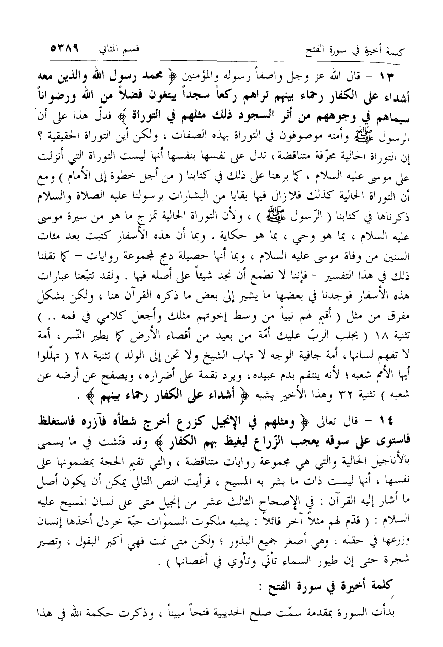 قال الله عزّ وجل واصفاً رسوله والمؤمنين مُحَمَّدٌ رَسُولُ اللَّهِ وَالَّذِينَ مَعَهُ أَشِدَّاءُ عَلَى الْكُفَّارِ رُحَماءُ بَيْنَهُمْ تَراهُمْ رُكَّعاً سُجَّداً يَبْتَغُونَ فَضْلًا مِنَ اللَّهِ وَرِضْواناً سِيماهُمْ فِي وُجُوهِهِمْ مِنْ أَثَرِ السُّجُودِ ذلِكَ مَثَلُهُمْ فِي التَّوْراةِ فدلّ هذا على أن الرسول صلّى الله عليه وسلم وأمته موصوفون في التوراة بهذه الصفات، ولكن أين التوراة الحقيقية؟