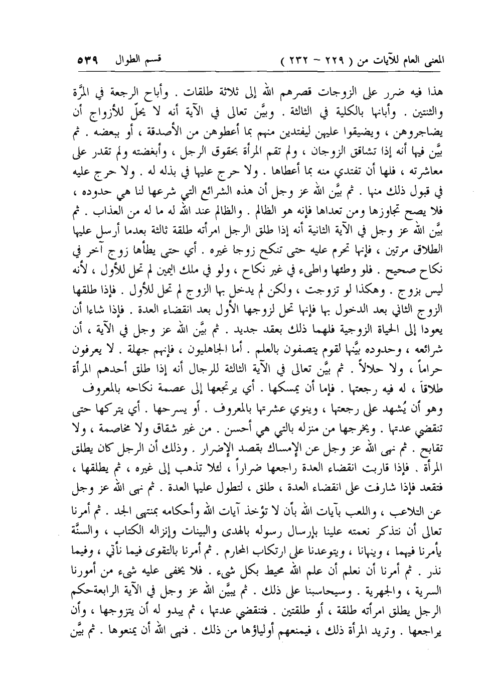 ما أرسل عليها الطلاق مرتين، فإنها تحرم عليه حتى تنكح زوجا غيره. أي حتى يطأها زوج آخر في نكاح صحيح. فلو وطئها واطئ في غير نكاح، ولو في ملك اليمين لم تحل للأول، لأنه ليس بزوج. وهكذا لو تزوجت، ولكن لم يدخل بها الزوج لم تحل للأول. فإذا طلقها الزوج الثاني بعد الدخول بها فإنها تحل لزوجها الأول بعد انقضاء العدة. فإذا شاءا أن يعودا إلى الحياة الزوجية فلهما ذلك بعقد جديد. ثم بين الله عزّ وجل في الآية، أن شرائعه، وحدوده بينها لقوم يتصفون بالعلم. أما الجاهليون، فإنهم جهلة. لا يعرفون حراما، ولا حلالا. ثم بين تعالى في الآية الثالثة للرجال أنه إذا طلق أحدهم المرأة طلاقا، له فيه رجعتها. فإما أن يمسكها. أي يرتجعها إلى عصمة نكاحه بالمعروف وهو أن يشهد على رجعتها، وينوي عشرتها بالمعروف. أو يسرحها. أي يتركها حتى تنقضي عدتها. ويخرجها من منزله بالتي هي أحسن. من غير شقاق ولا مخاصمة، ولا تقابح. ثم نهى الله عزّ وجل عن الإمساك بقصد الإضرار. وذلك أن الرجل كان يطلق المرأة. فإذا قاربت انقضاء العدة راجعها ضرارا، لئلا تذهب إلى غيره، ثم يطلقها، فتقعد فإذا شارفت على انقضاء العدة، طلق، لتطول عليها العدة. ثم نهى الله عزّ وجل عن التلاعب، واللعب بآيات الله بأن لا تؤخذ آيات الله وأحكامه بمنتهى الجد. ثم أمرنا تعالى أن نتذكر نعمته علينا بإرسال رسوله بالهدى والبينات وإنزاله الكتاب، والسنة يأمرنا فيهما، وينهانا، ويتوعدنا على ارتكاب المحارم. ثم أمرنا بالتقوى فيما نأتي، وفيما نذر. ثم أمرنا أن نعلم أن علم الله محيط بكل شئ. فلا يخفى عليه شئ من أمورنا السرية، والجهرية. وسيحاسبنا على ذلك. ثم يبين الله عزّ وجل في الآية الرابعة حكم الرجل يطلق امرأته طلقة، أو طلقتين. فتنقضي عدتها، ثم يبدو له أن يتزوجها، وأن يراجعها. وتريد المرأة ذلك، فيمنعهم أولياؤها من ذلك. فنهى الله أن يمنعوها. ثم بين